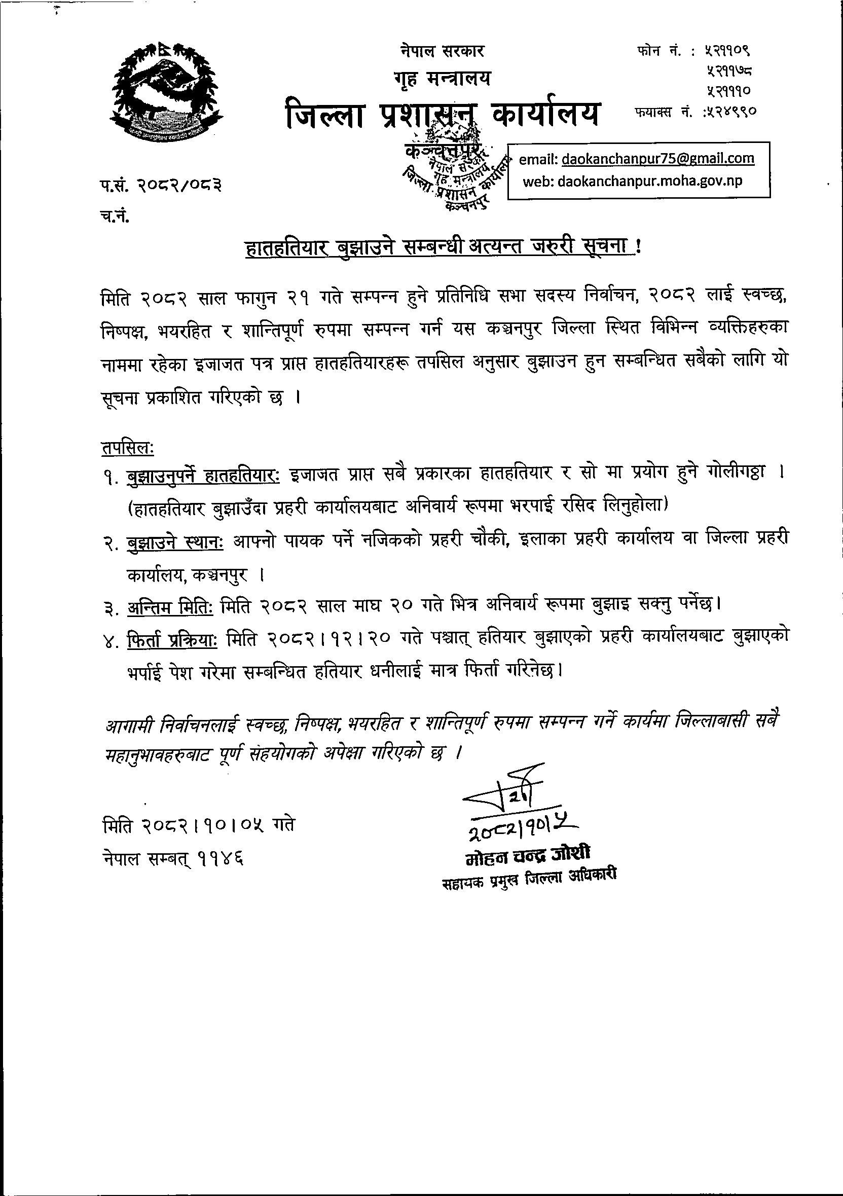 2082-10-05 हातहतियार बुझाउने सम्बन्धी अत्यन्त जरुरी सूचना !