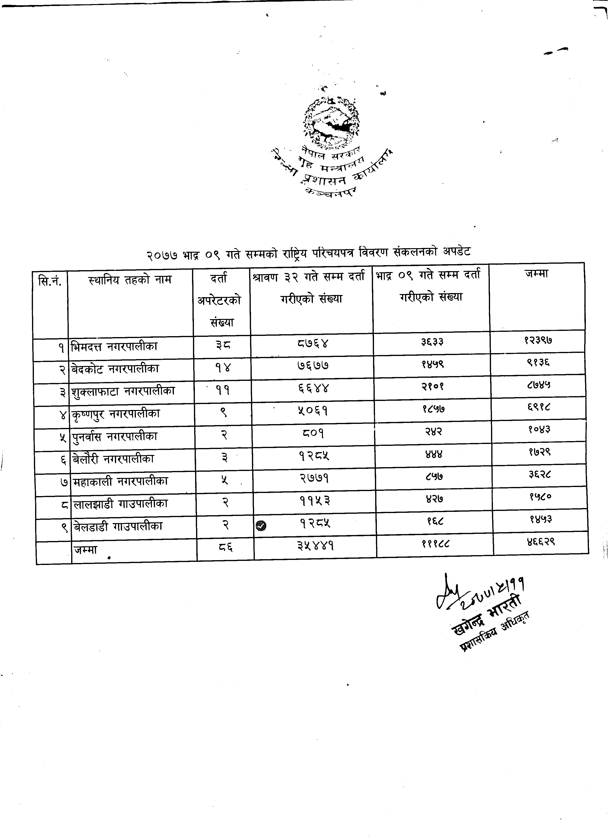२०७७ भाद्र ९ गते सम्मको राष्ट्रिय परिचयपत्र विवरण संकलनको अपडेट ।