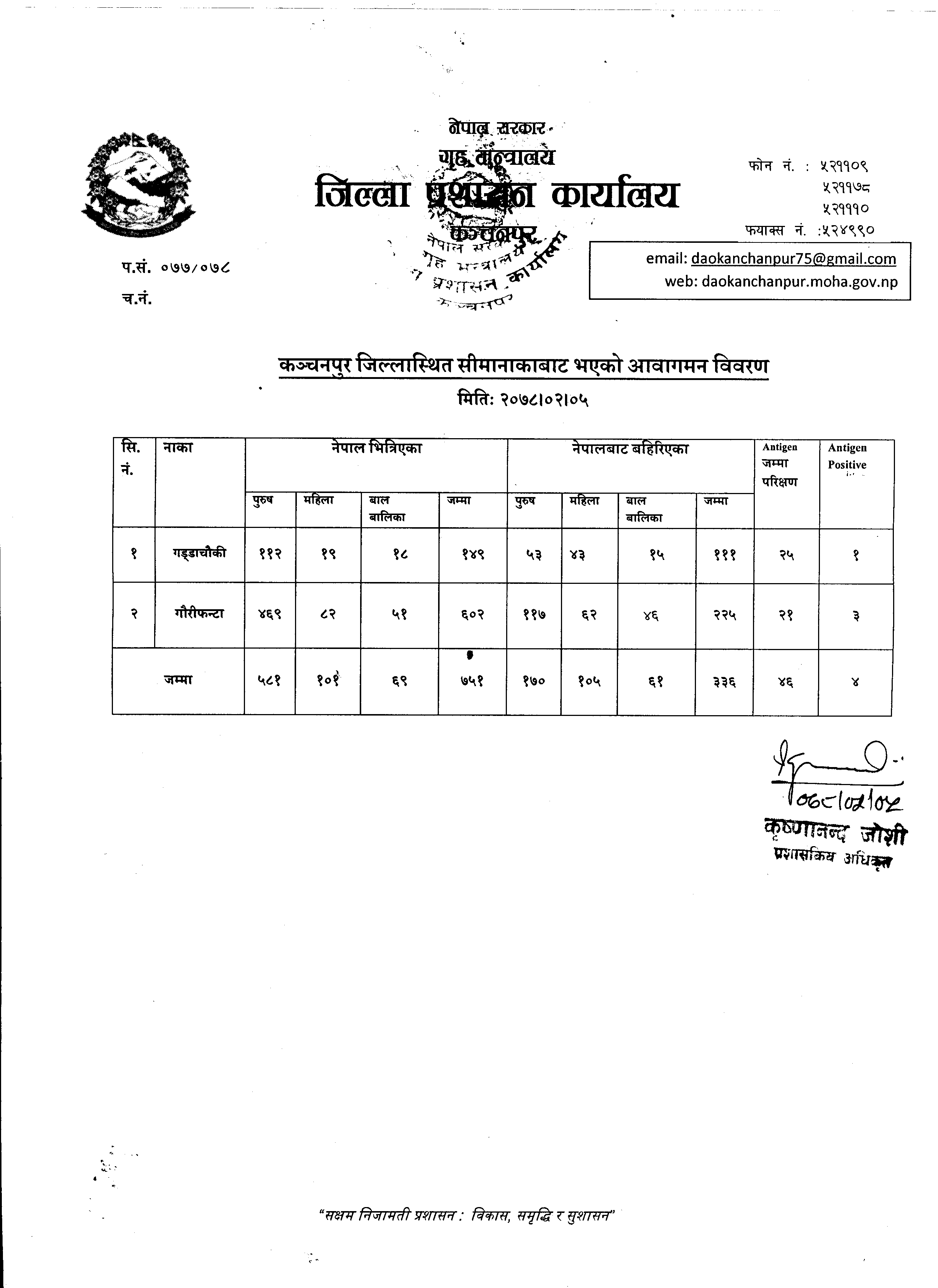 मिति २०७८।०२।०५ गते सीमानाकाबाट भएको आवागमन विवरण ।