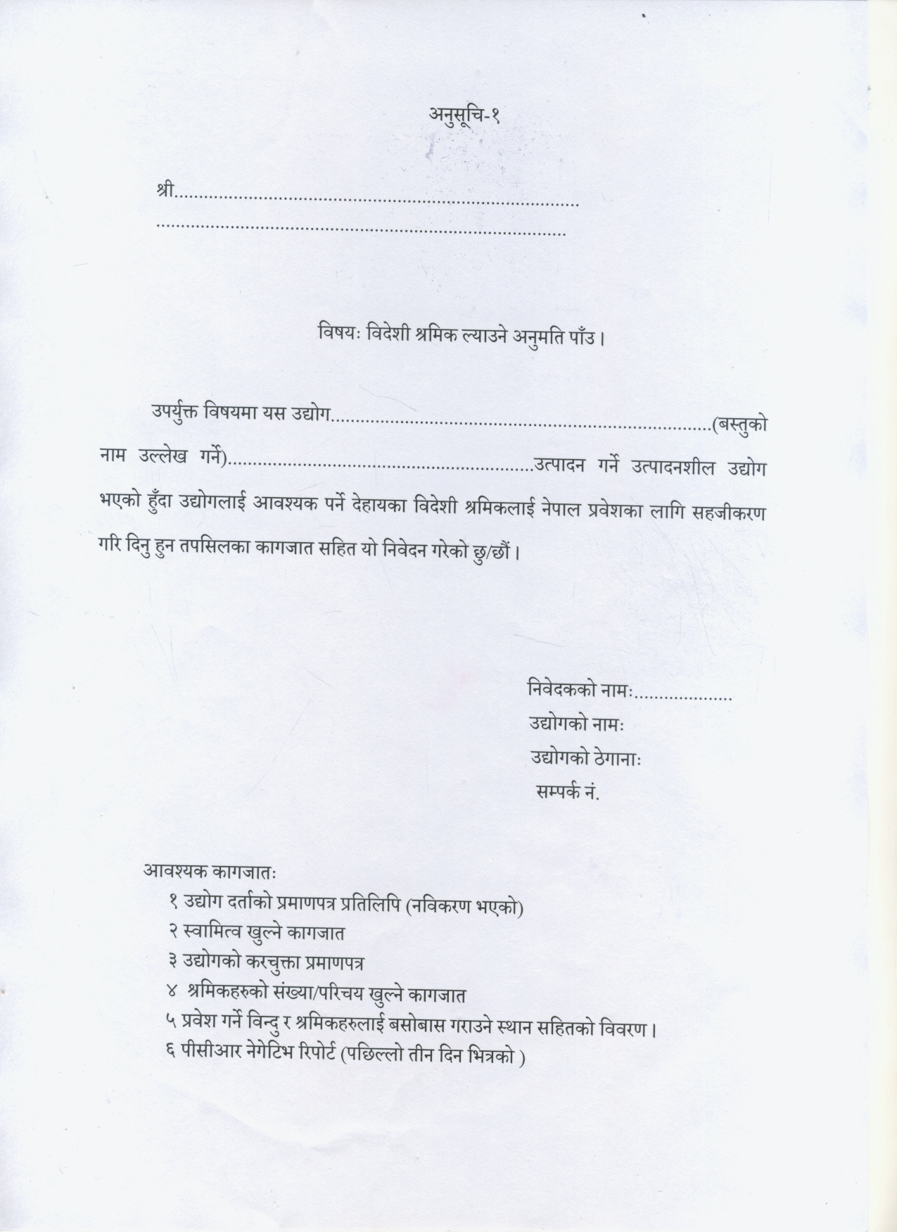 उत्पादनशिल उद्योगलाई आवश्यक पर्ने विदेशी श्रमिक ल्याउने निवेदनको ढाँचा ।