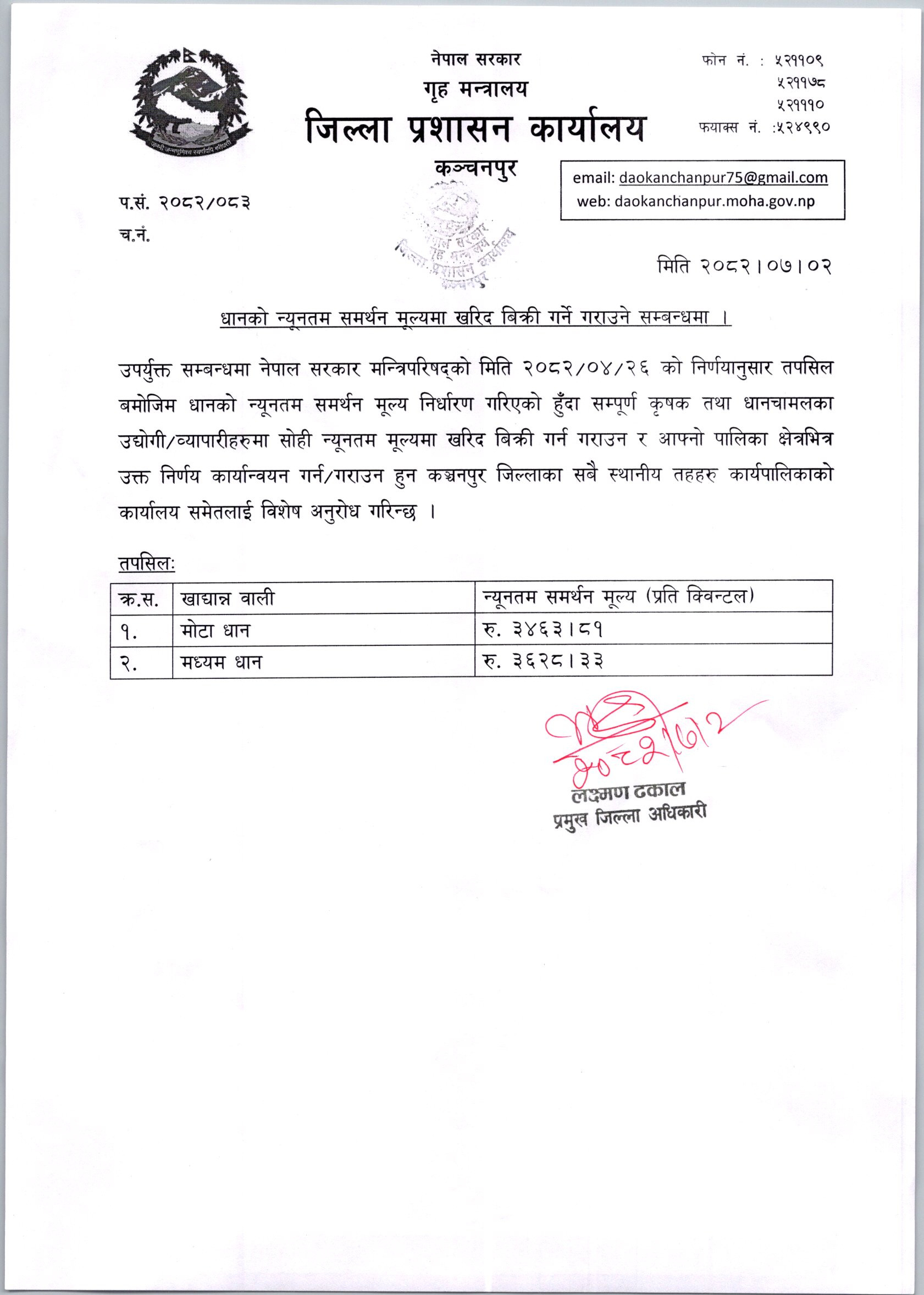 धानको न्यूनतम समर्थन मूल्यमा खरिद बिक्री गर्ने गराउने सम्बन्धमा ।
