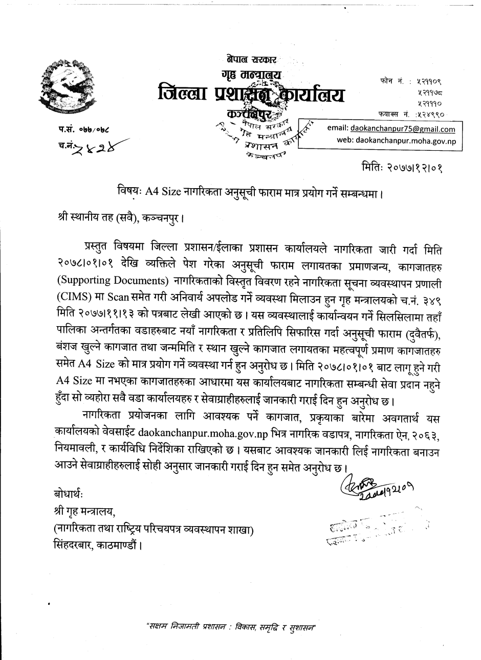 A4 Size नागरिकता अनुसुची फाराम मात्र प्रयोग गर्ने सम्बन्धमा ।