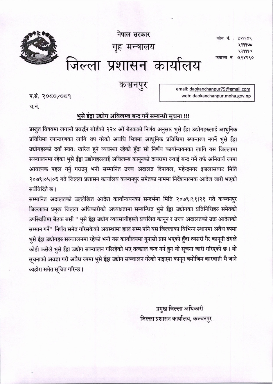 भुसे ईट्टा उद्योग अविलम्ब बन्द गर्ने सम्बन्धी सूचना !