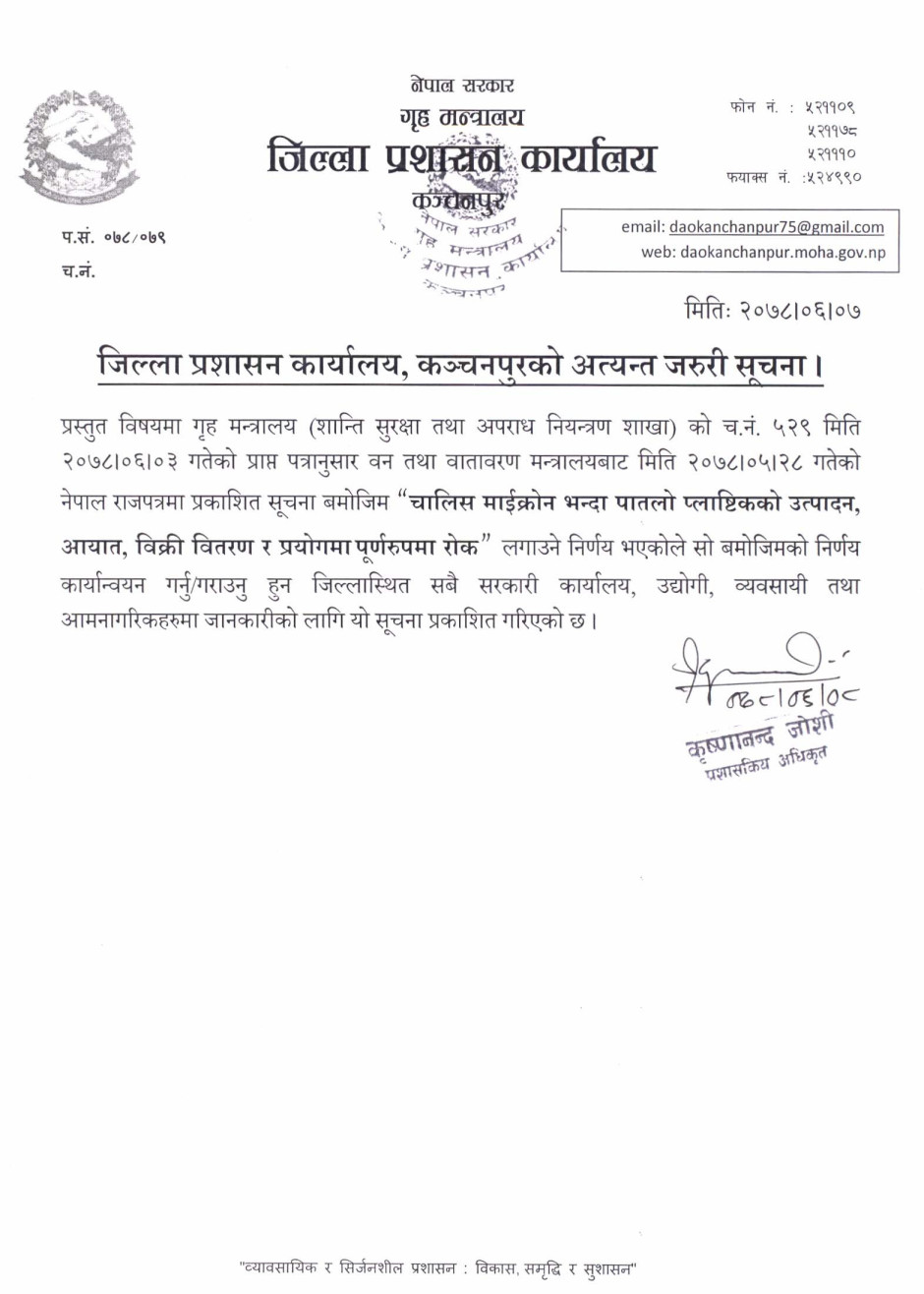 चालिस माईक्रोन भन्दा पातलो प्लाष्टिकको उत्पादन, आयात, विक्री वितरण र प्रयोगमा पुर्ण रोक लगाउने सम्बन्धमा ।
