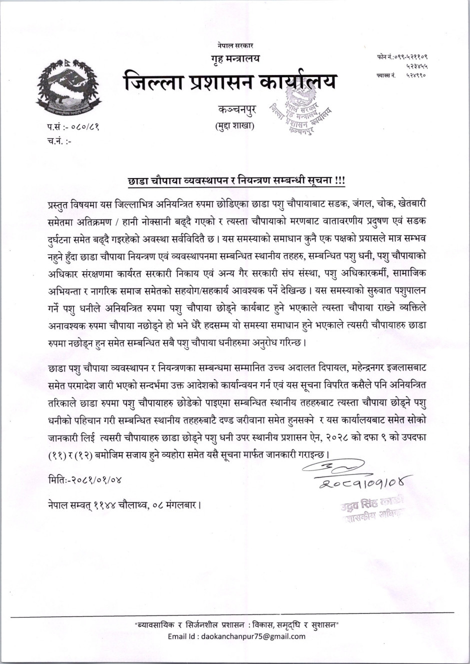 छाडा चौपाया व्यवस्थापन र नियन्त्रण सम्बन्धी सूचना ।।
