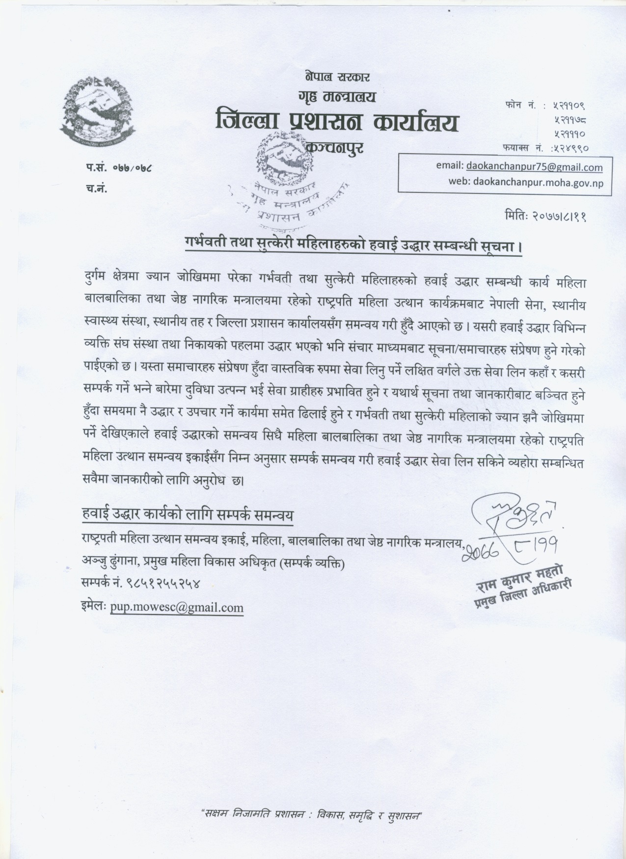 गर्भवती तथा सुत्केरी महिलाहरुको हवाई उद्धार सम्बन्धी सूचना !!!