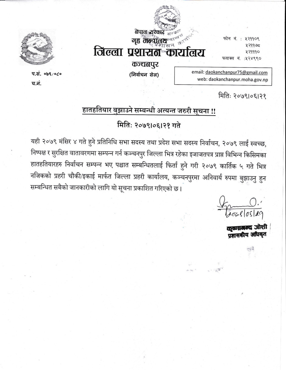 हातहतियार बुझाउने सम्बन्धी अत्यन्त जरुरी सूचना ।