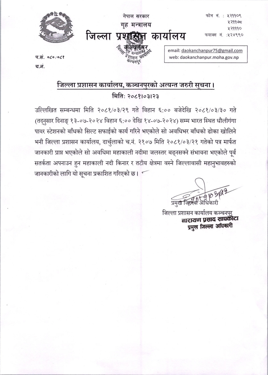 जिल्ला प्रशासन कार्यालय कञ्चनपुरको अत्यन्त जरुरी सूचना ।।