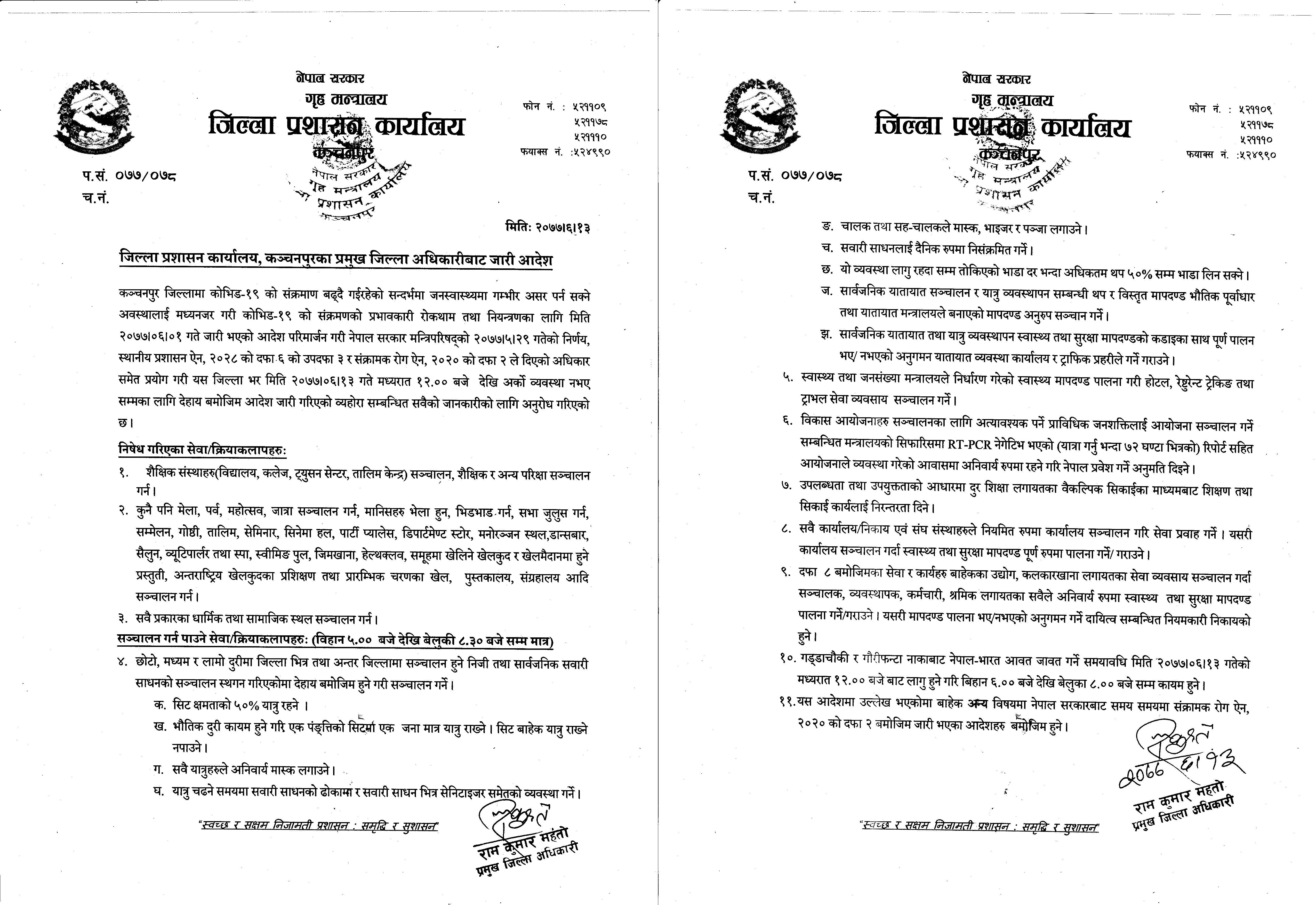 जिल्ला प्रशासन कार्यालय कञ्चनपुरका प्रमुख जिल्ला अधिकारीबाट मिति २०७७/०६/१३ गते जारी गरेको आदेश ।