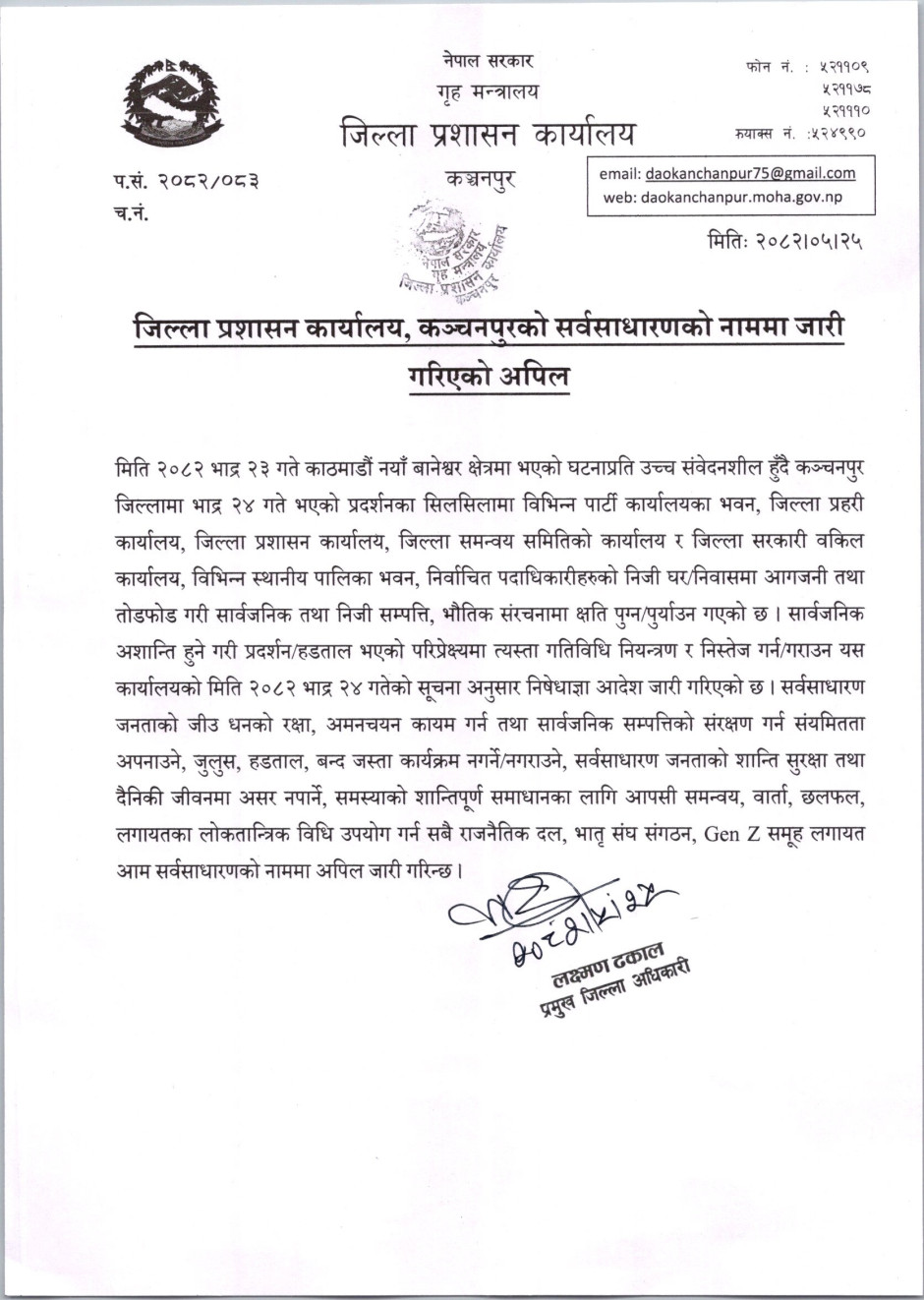 जिल्ला प्रशासन कार्यालय, कञ्चनपुरको सर्वसाधारणको नाममा जारी गरिएको अपिल।