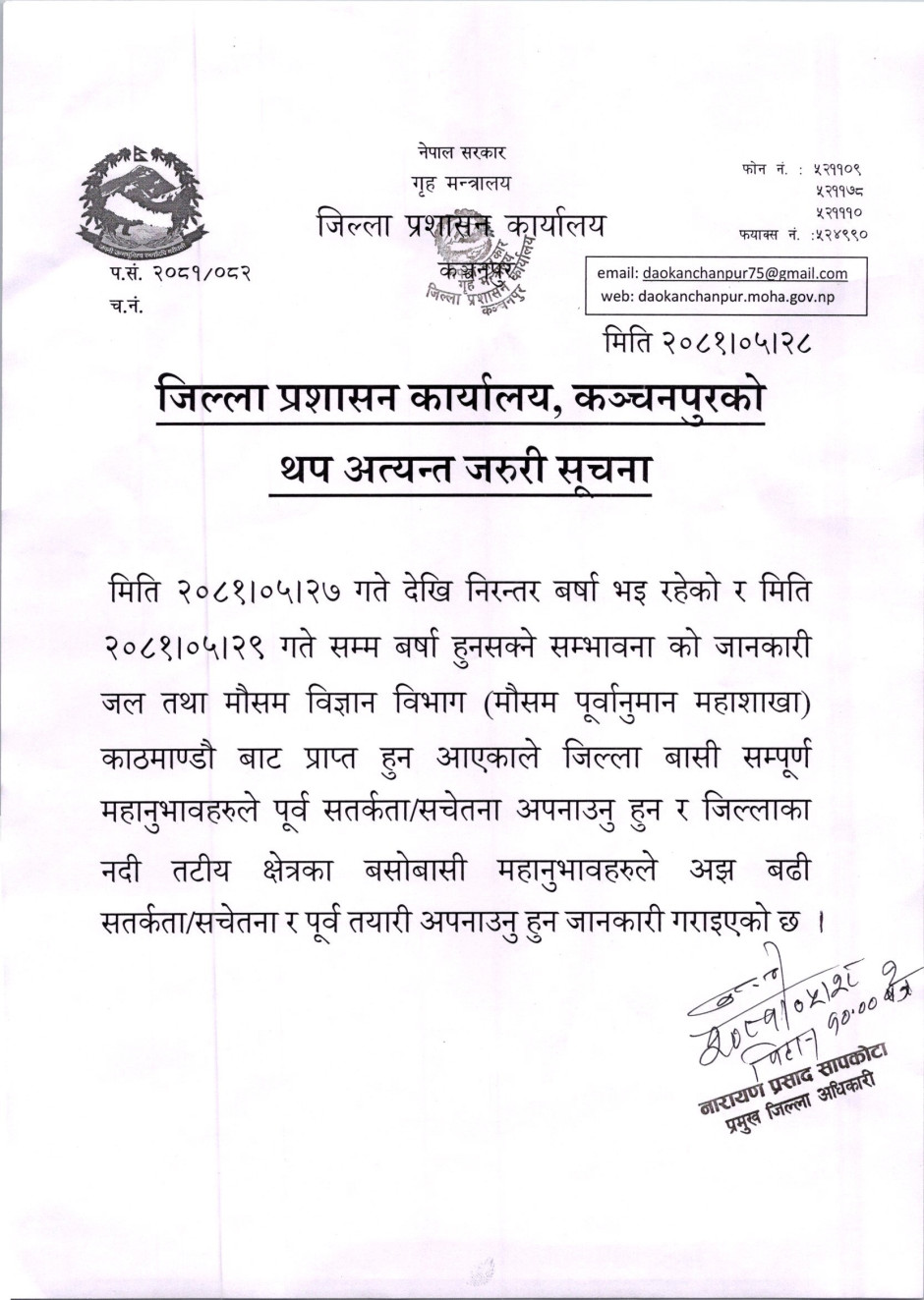 जिल्ला प्रशासन कार्यालय, कञ्चनपुरको थप अत्यन्त जरुरी सूचना ।