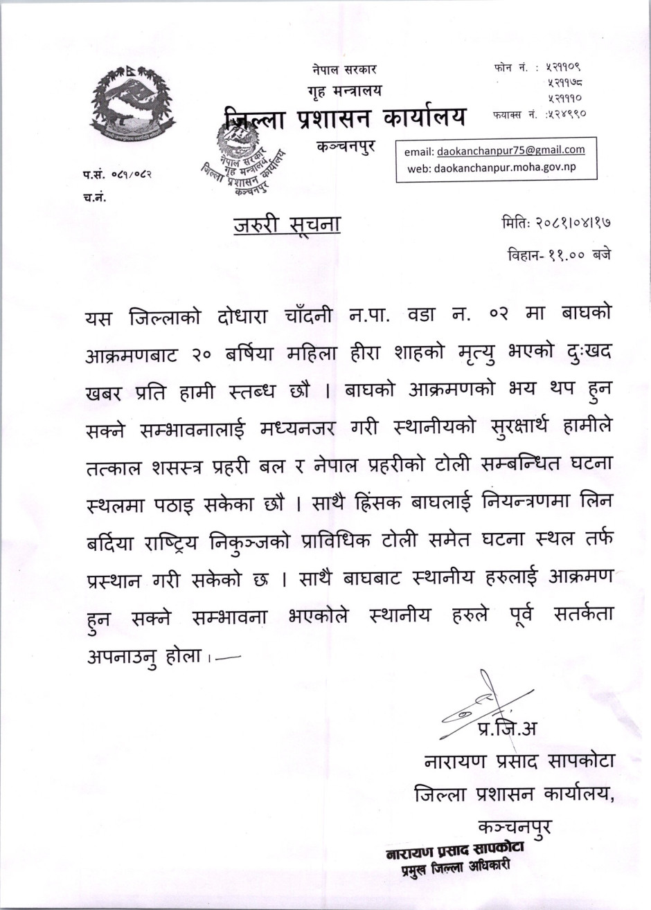 © सर्वाधिकार सुरक्षित जिल्ला प्रशासन कार्यालय, कन्चनपुर
