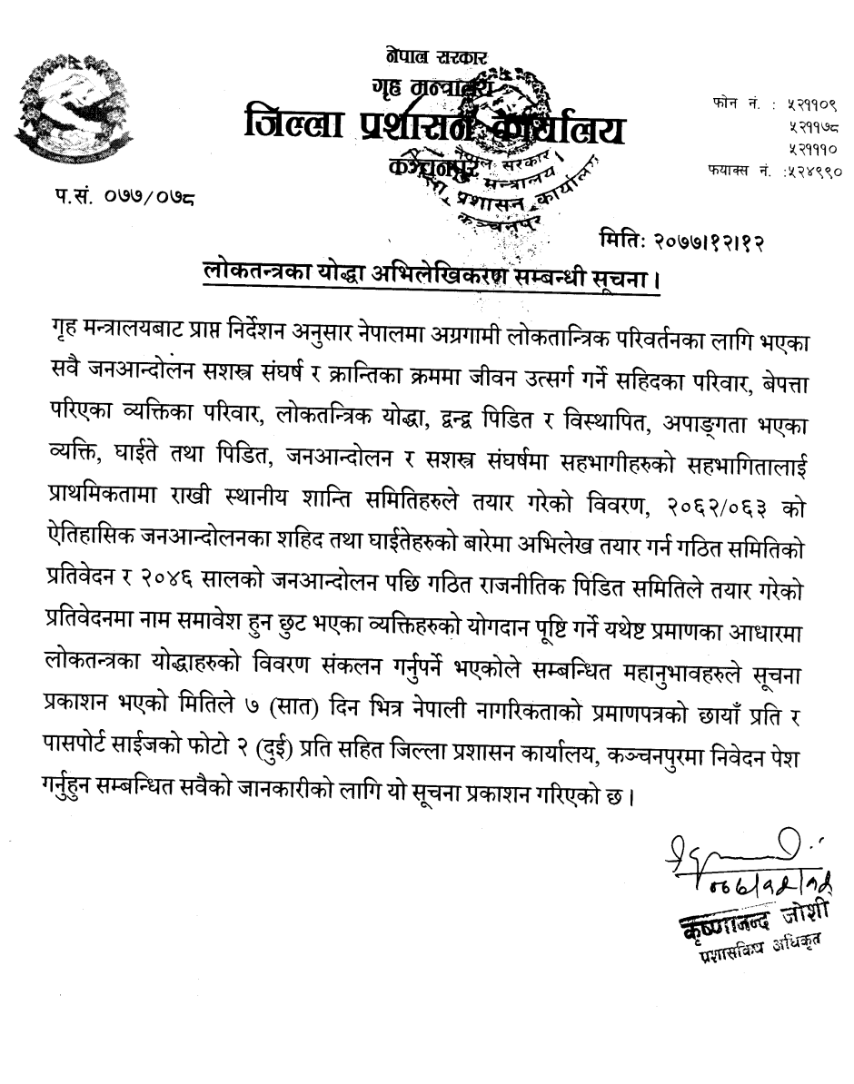 लाेकतन्त्रका याेद्धा अभिलेखिकरण सम्बन्धी सूचना !!!