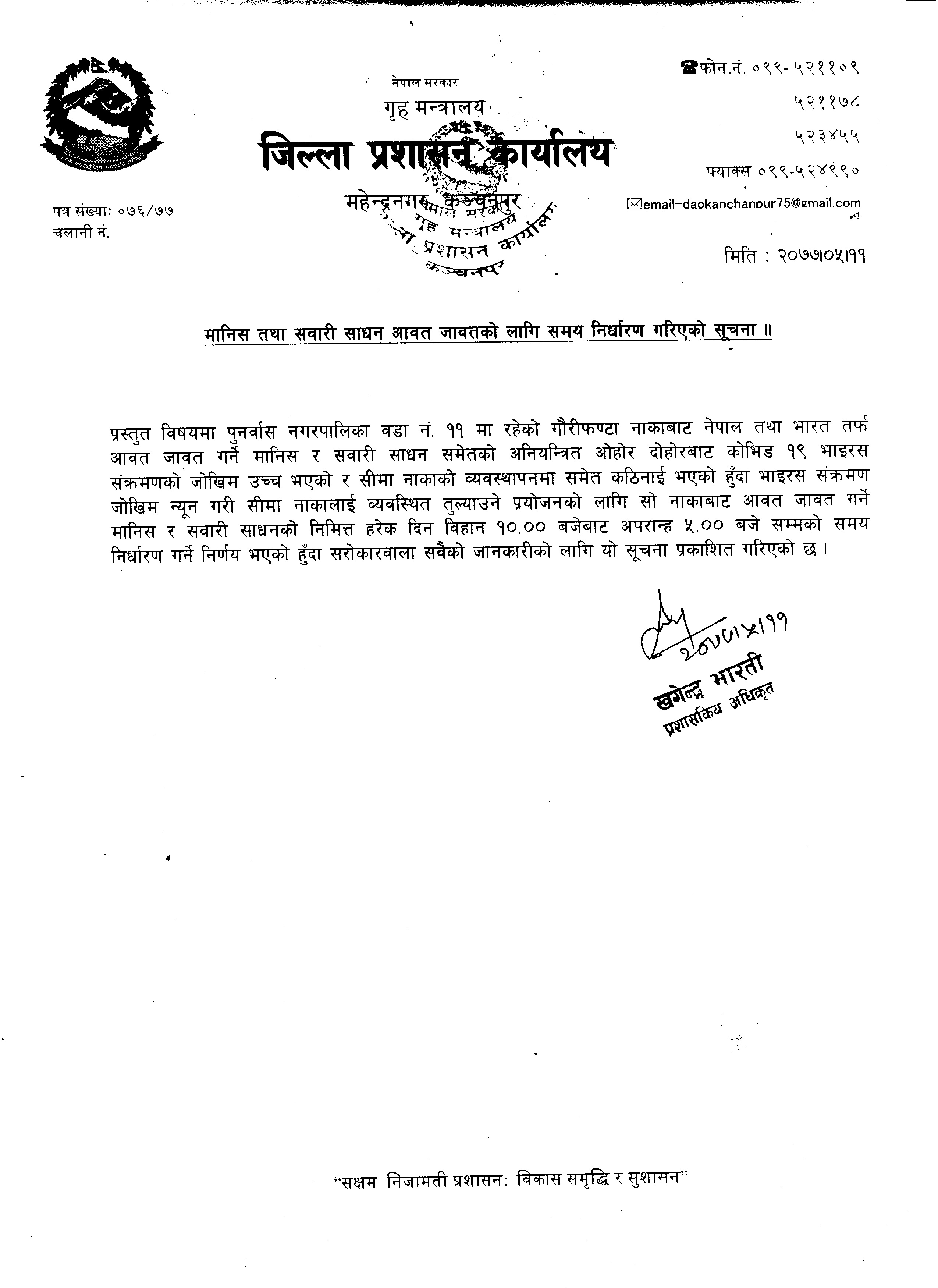 मानिस तथा सवारी साधन आवत जावतकाे लागी समय निर्धारण गरीएकाे सुचना ।।