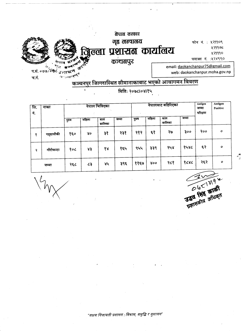 मिति २०७८।०४।१५ गते सीमानाकाबाट भएको आवागमन विवरण
