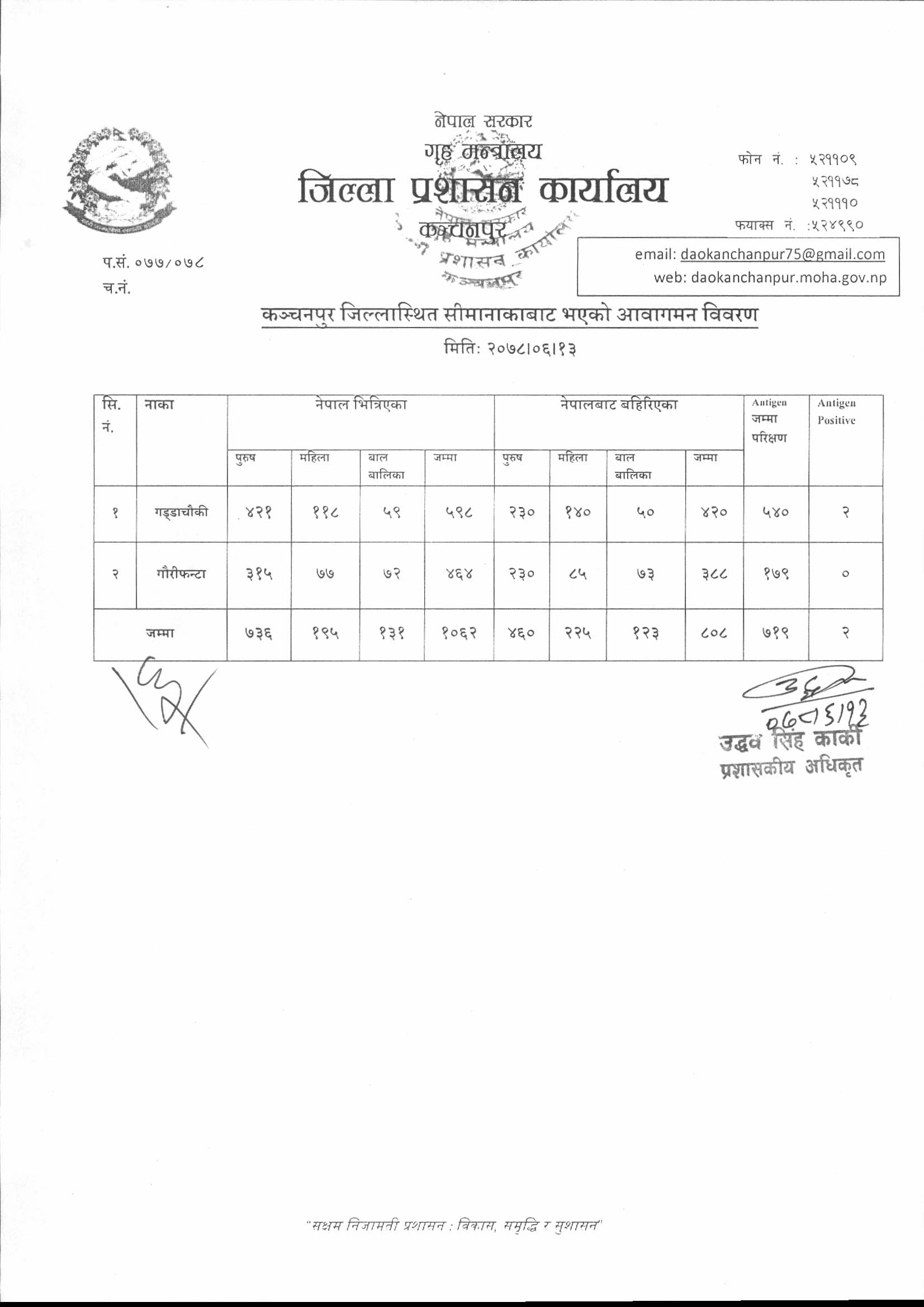 मिति २०७८।०६।१३ गते सीमानाकाबाट भएको आवागमन विवरण ।
