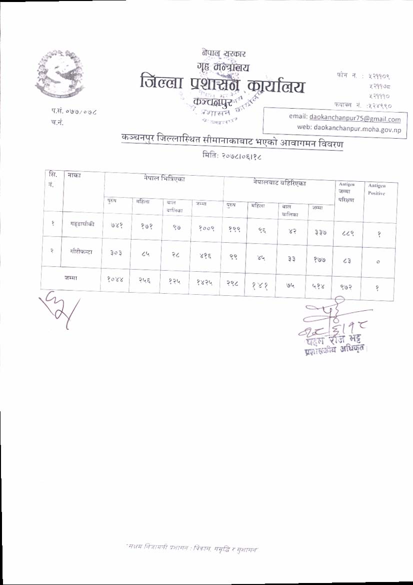 मिति २०७८।०६।१८ गते सीमानाकाबाट भएको आवागमन विवरण ।