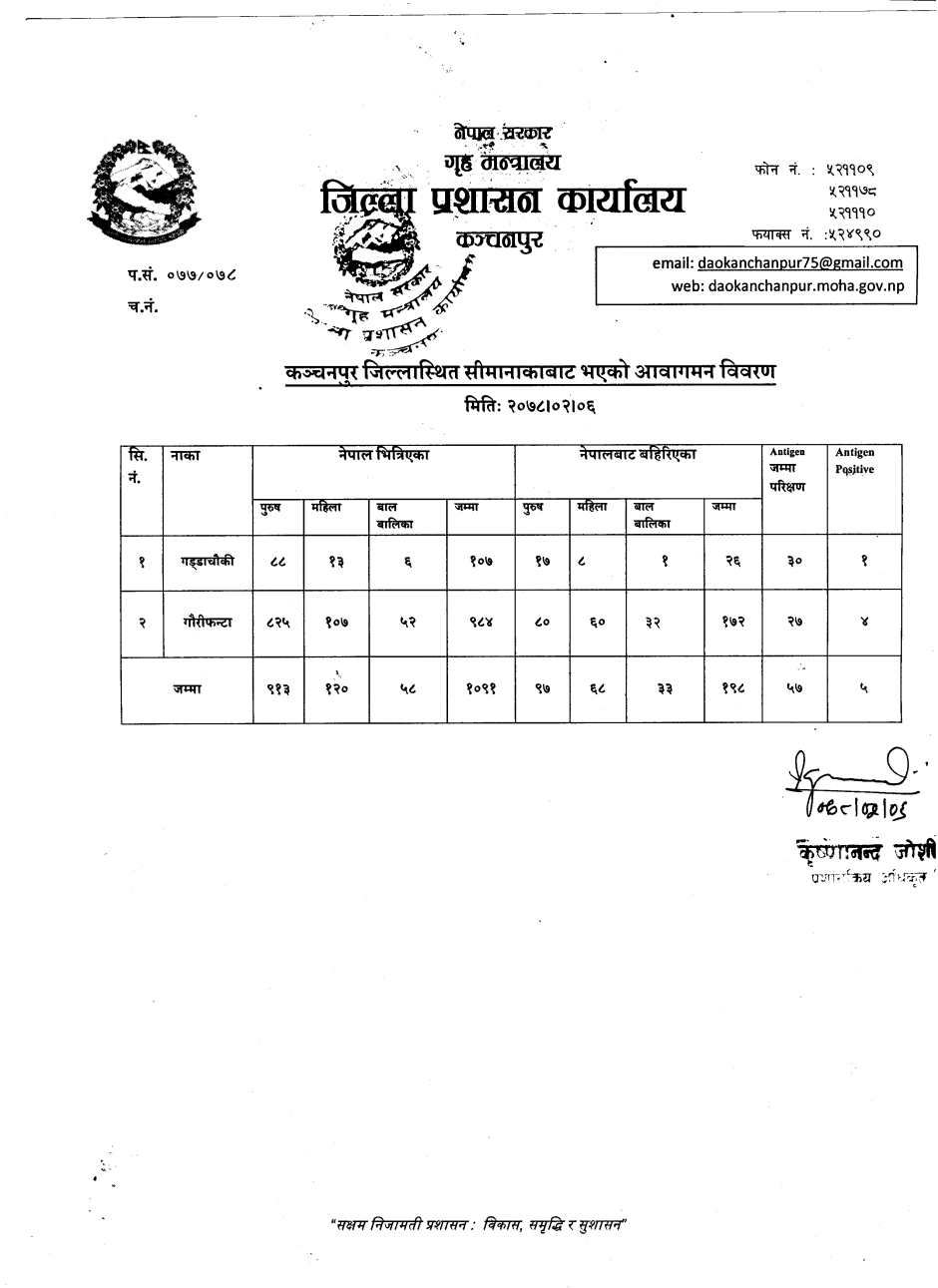 मिति २०७८।०२।०६ गते सीमानाकाबाट भएको आवागमन विवरण ।