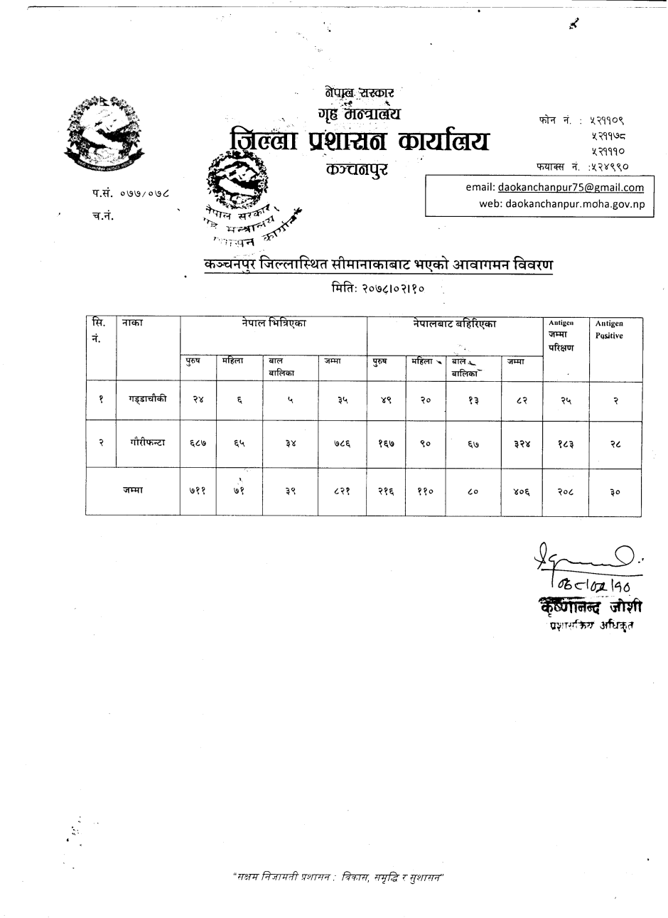 मिति २०७८।०६।१९ गते सीमानाकाबाट भएको आवागमन विवरण ।