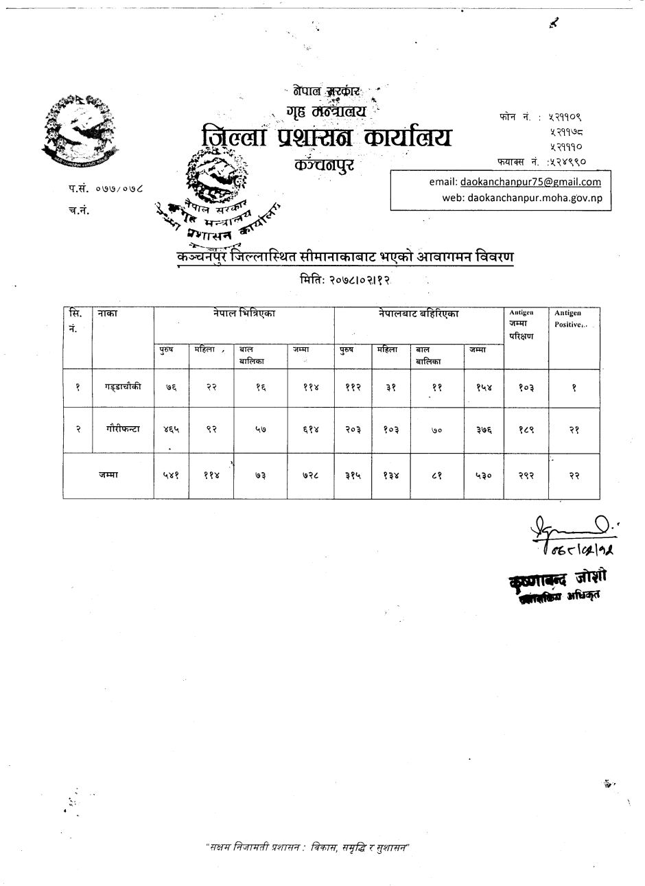 मिति २०७८।०२।१२ गते सीमानाकाबाट भएको आवागमन विवरण ।