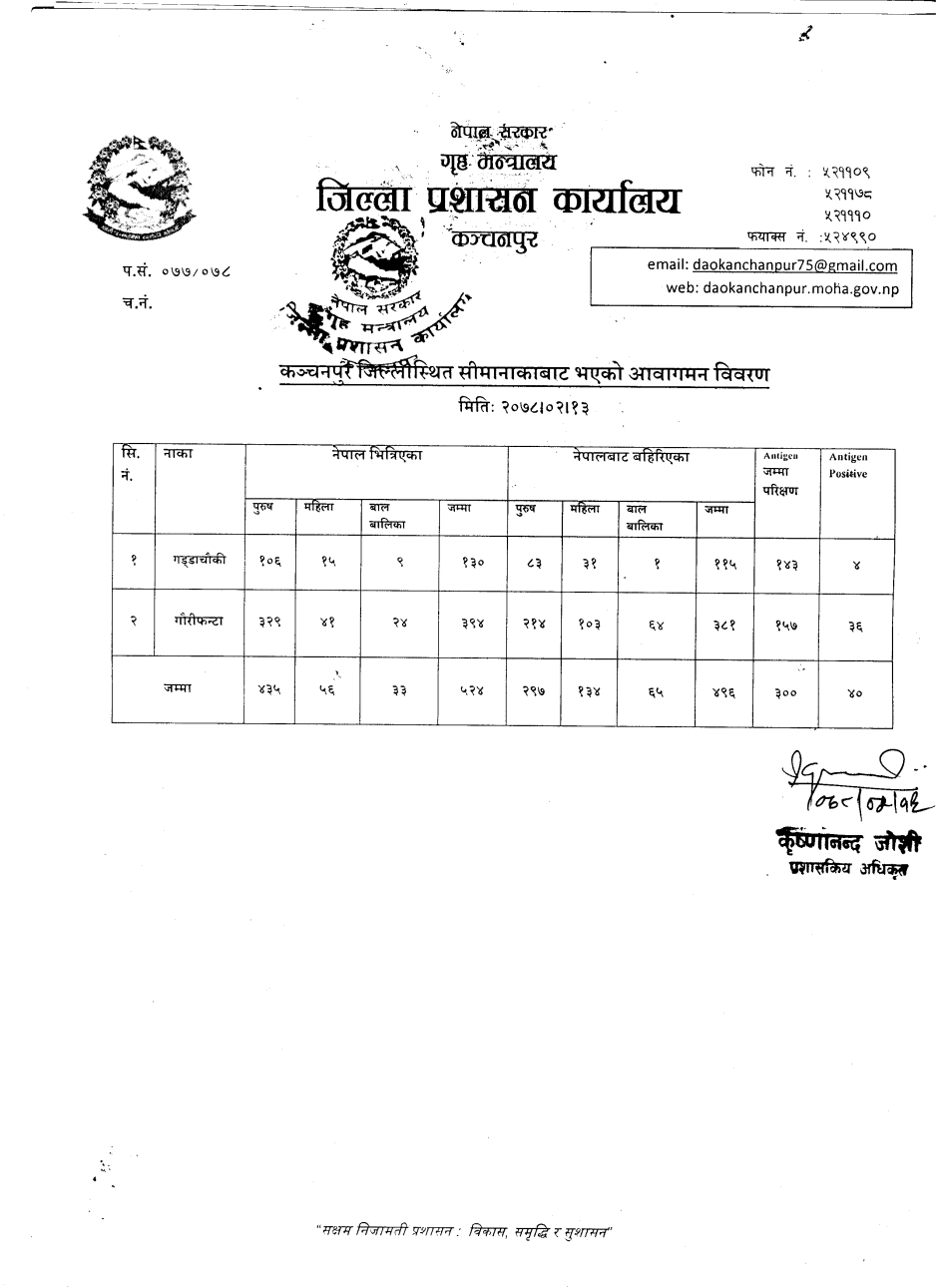 मिति २०७८।०२।१३ गते सीमानाकाबाट भएको आवागमन विवरण ।