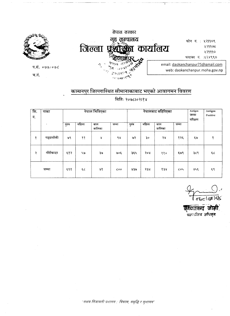 मिति २०७८।०६।१९ गते सीमानाकाबाट भएको आवागमन विवरण ।