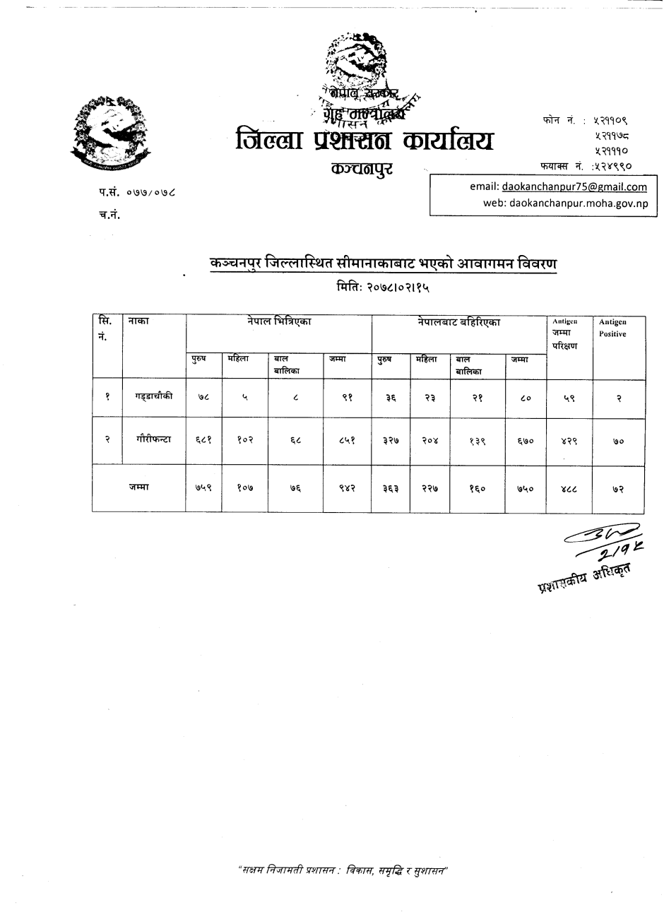 मिति २०७८।०२।१५ गते सीमानाकाबाट भएको आवागमन विवरण ।