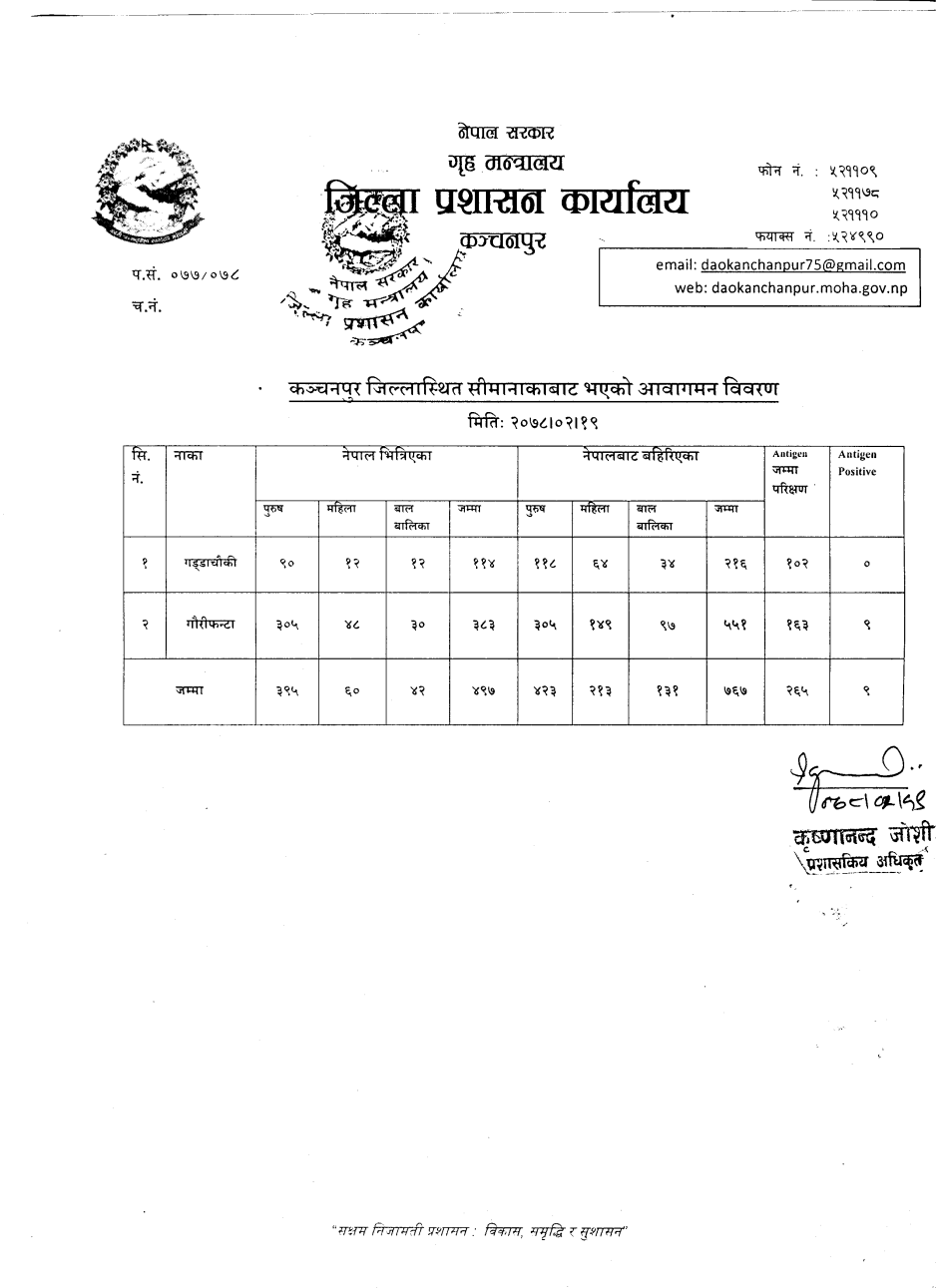 मिति २०७८।०२।१९ गते सीमानाकाबाट भएको आवागमन विवरण ।