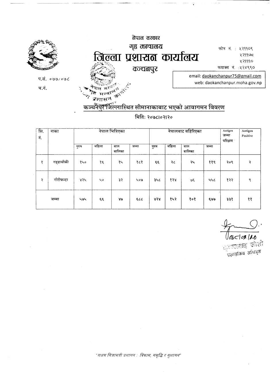 मिति २०७८।०२।२० गते सीमानाकाबाट भएको आवागमन विवरण ।