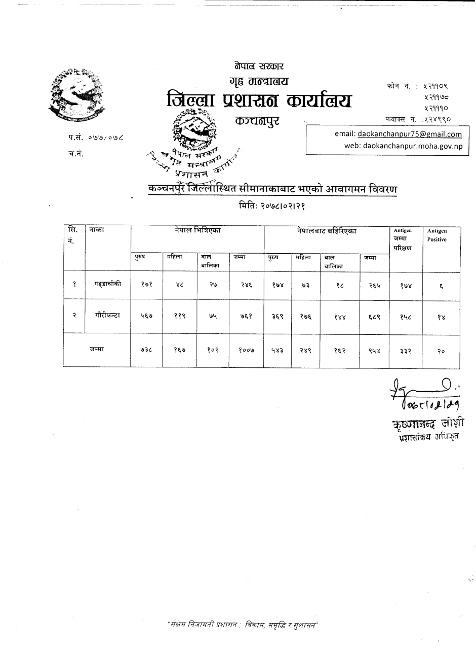 मिति २०७८।०२।२१ गते सीमानाकाबाट भएको आवागमन विवरण ।