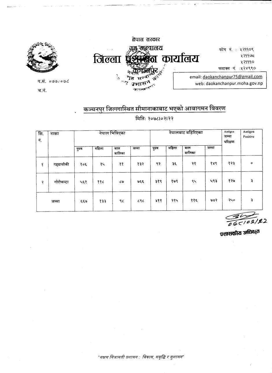 मिति २०७८।०२।२२ गते सीमानाकाबाट भएको आवागमन विवरण ।