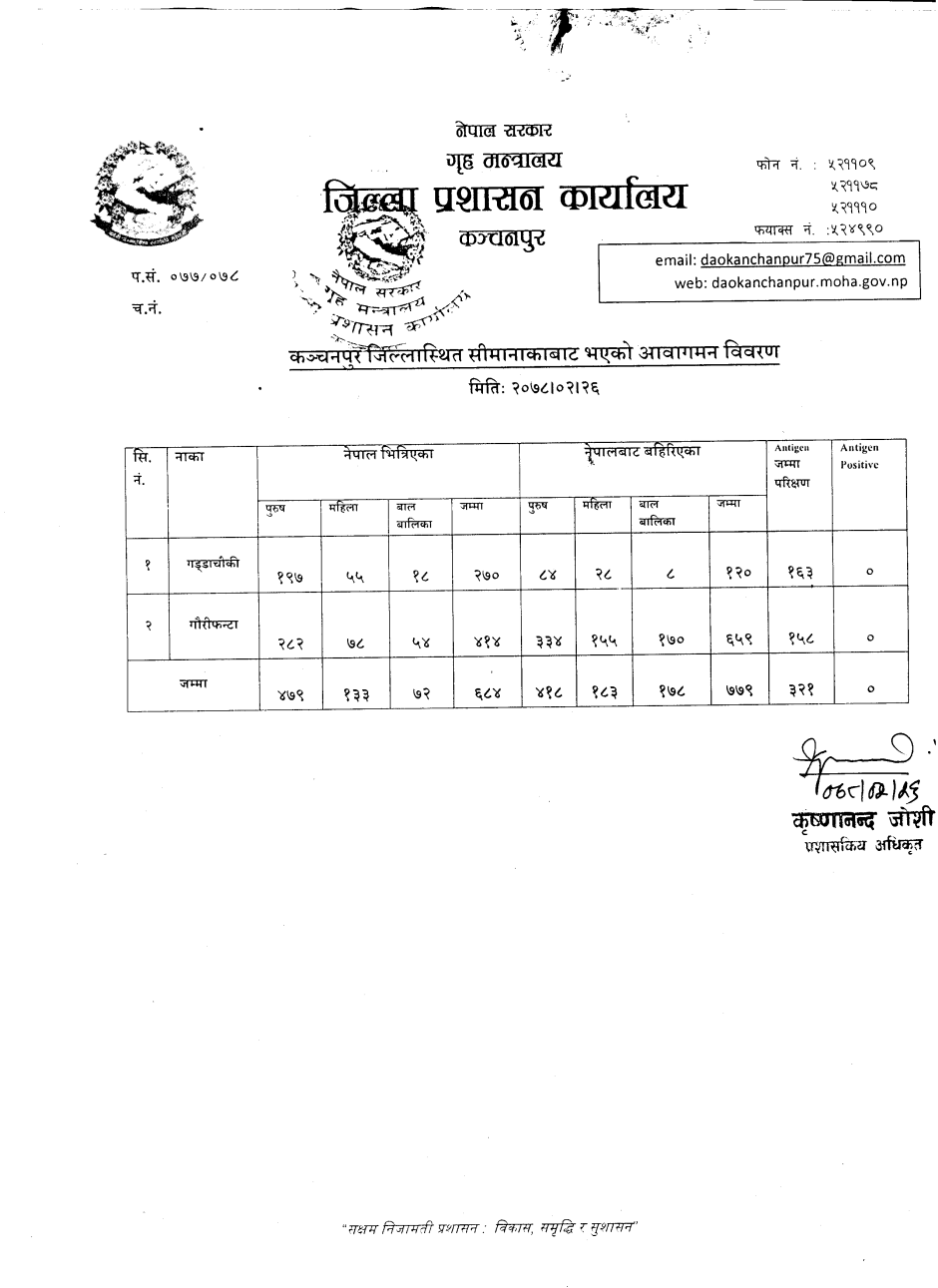 मिति २०७८।०२।२६ गते सीमानाकाबाट भएको आवागमन विवरण ।