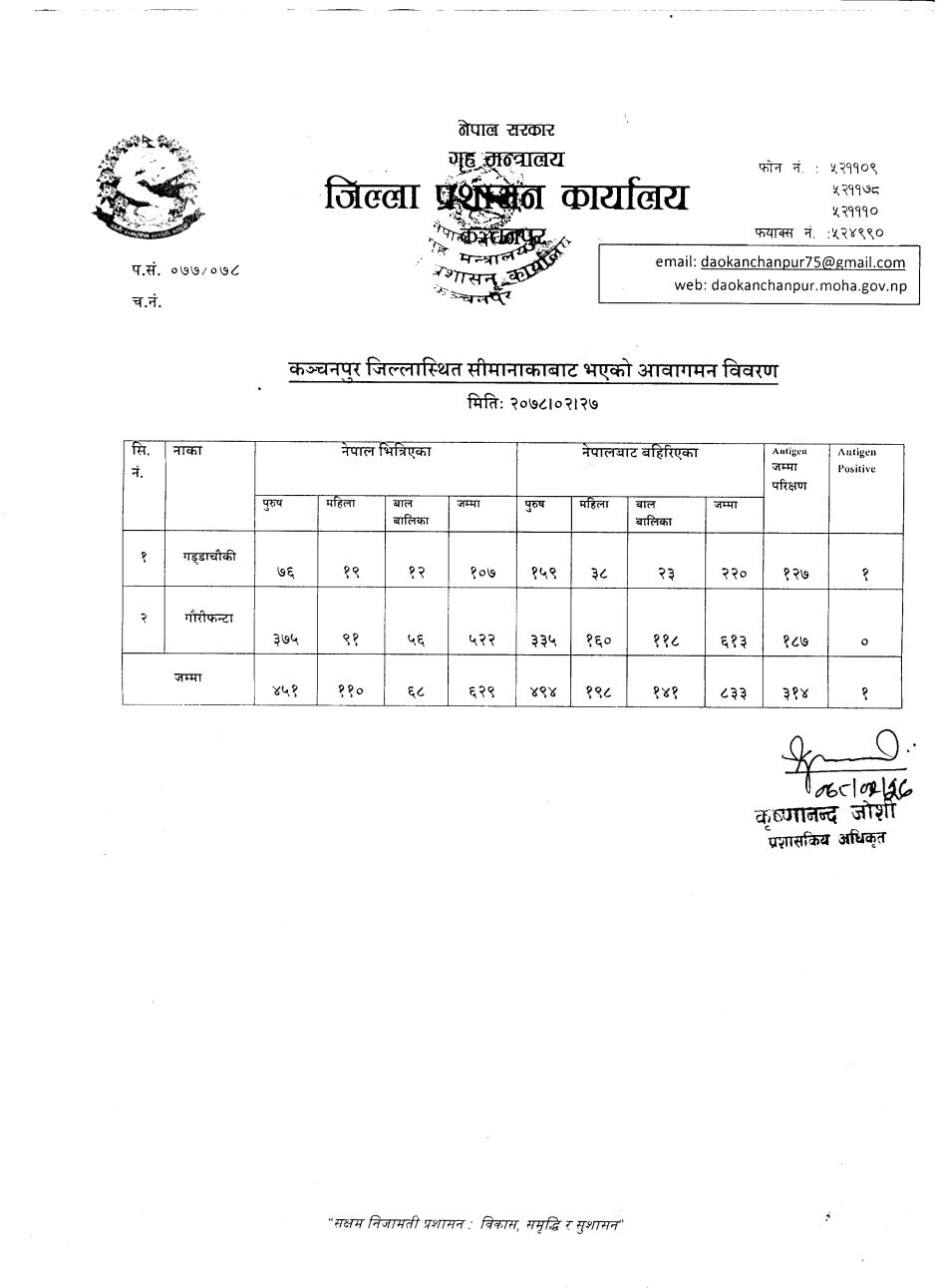 मिति २०७८।०२।२७ गते सीमानाकाबाट भएको आवागमन विवरण ।