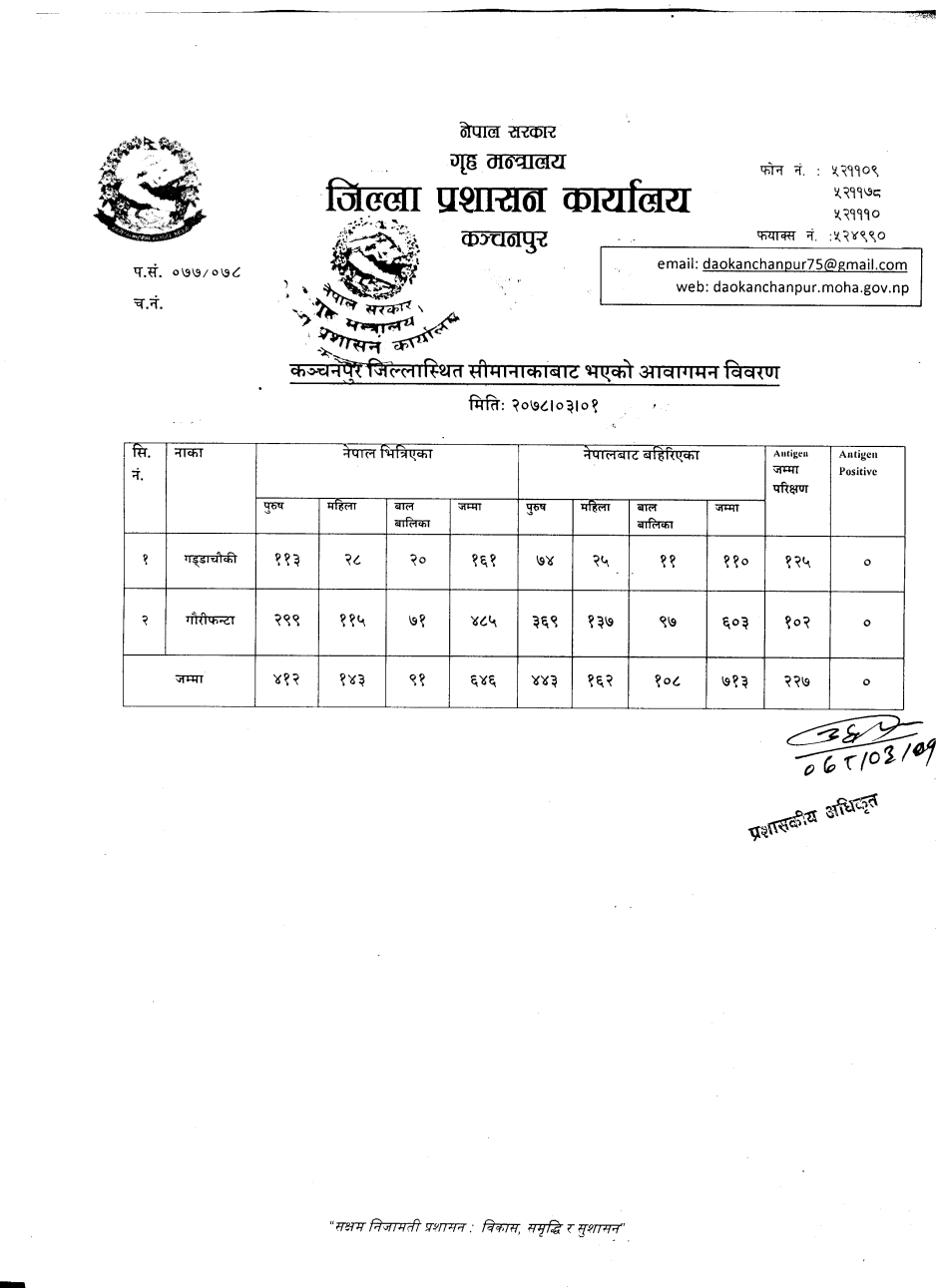 मिति २०७८।०३।०१ गते सीमानाकाबाट भएको आवागमन विवरण ।