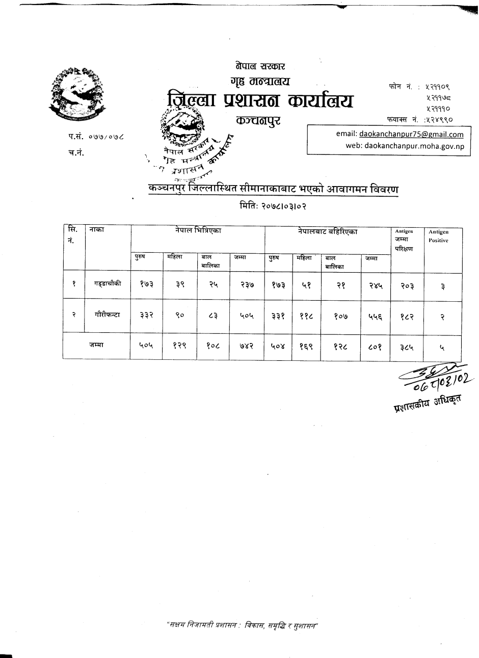 मिति २०७८।०३।०२ गते सीमानाकाबाट भएको आवागमन विवरण ।