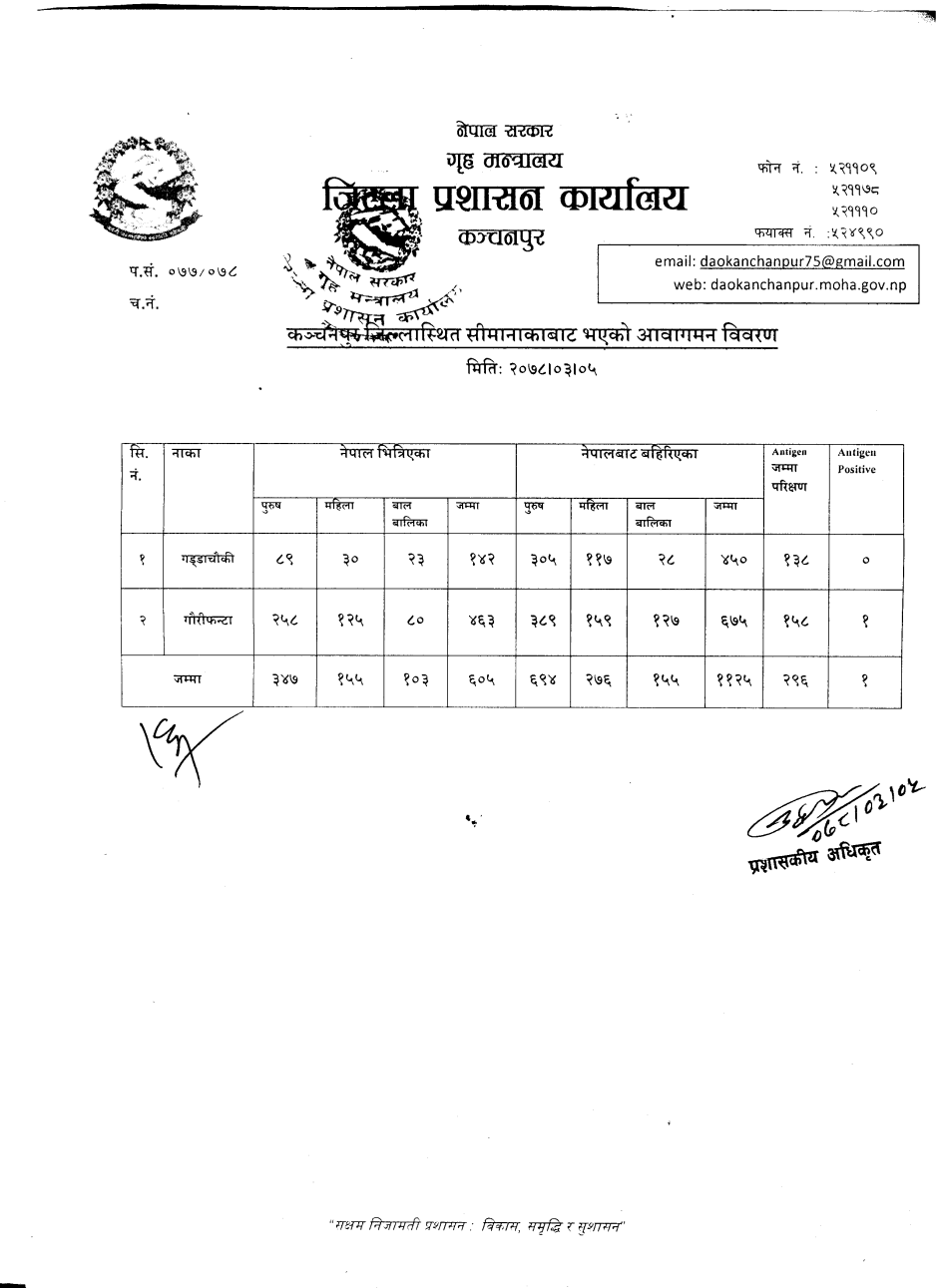 मिति २०७८।०३।०५ गते सीमानाकाबाट भएको आवागमन विवरण ।