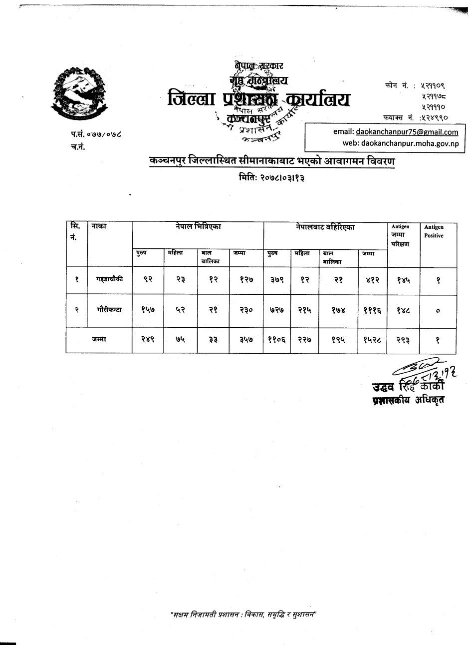 मिति २०७८।०३।१३ गते सीमानाकाबाट भएको आवागमन विवरण ।