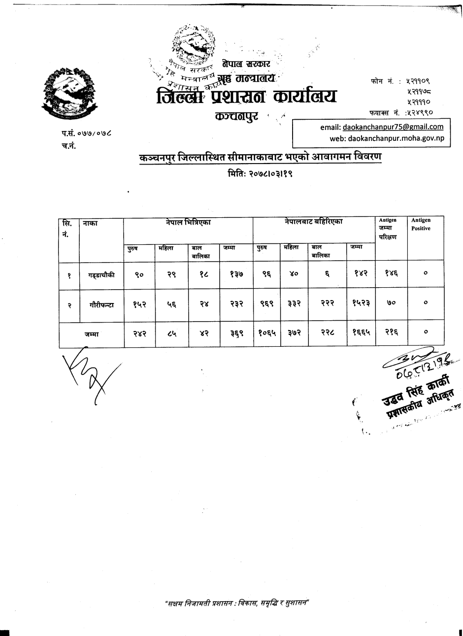 मिति २०७८।०३।१९ गते सीमानाकाबाट भएको आवागमन विवरण ।