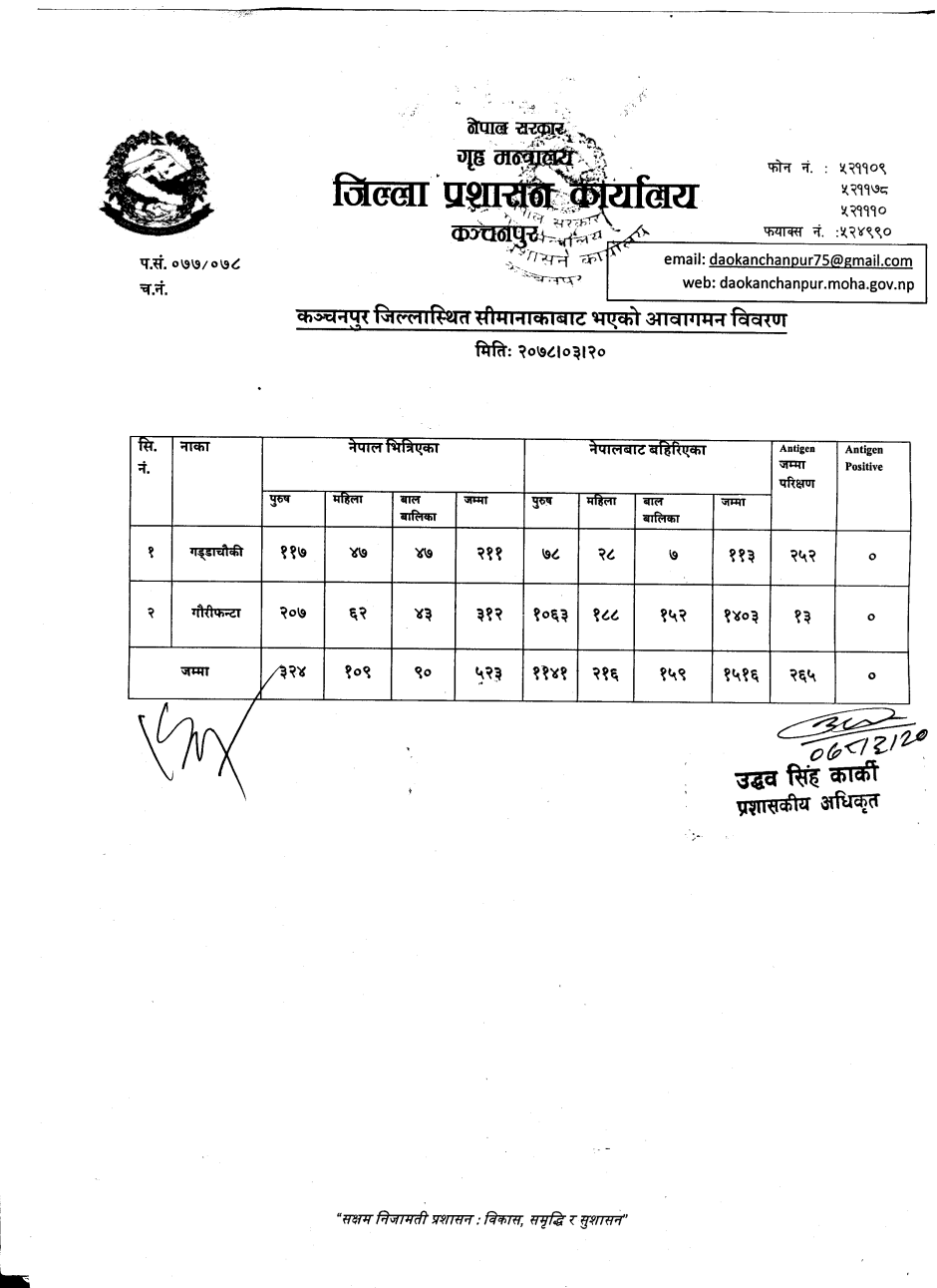 मिति २०७८।०३।२० गते सीमानाकाबाट भएको आवागमन विवरण ।