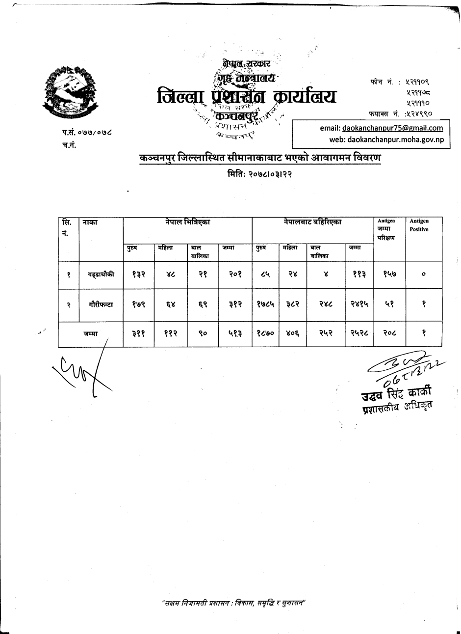 मिति २०७८।०३।२२ गते सीमानाकाबाट भएको आवागमन विवरण