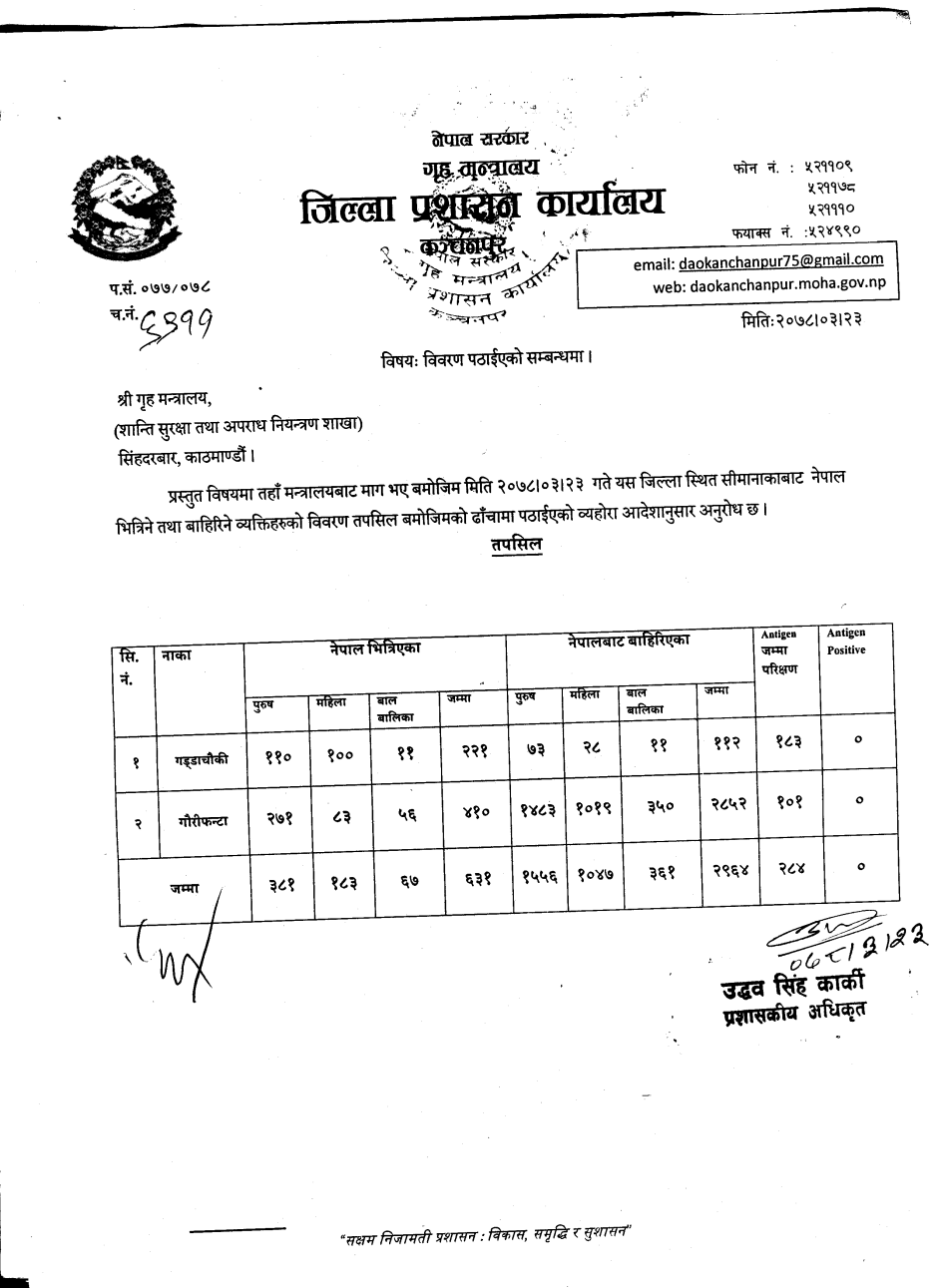 मिति २०७८।०३।२३ गते सीमानाकाबाट भएको आवागमन विवरण