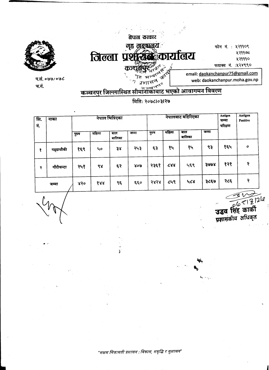 मिति २०७८।०३।२७ गते सीमानाकाबाट भएको आवागमन विवरण
