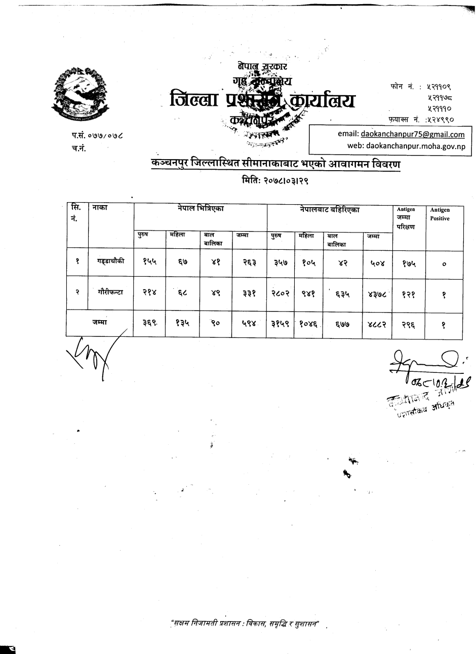 मिति २०७८।०३।२९ गते सीमानाकाबाट भएको आवागमन विवरण