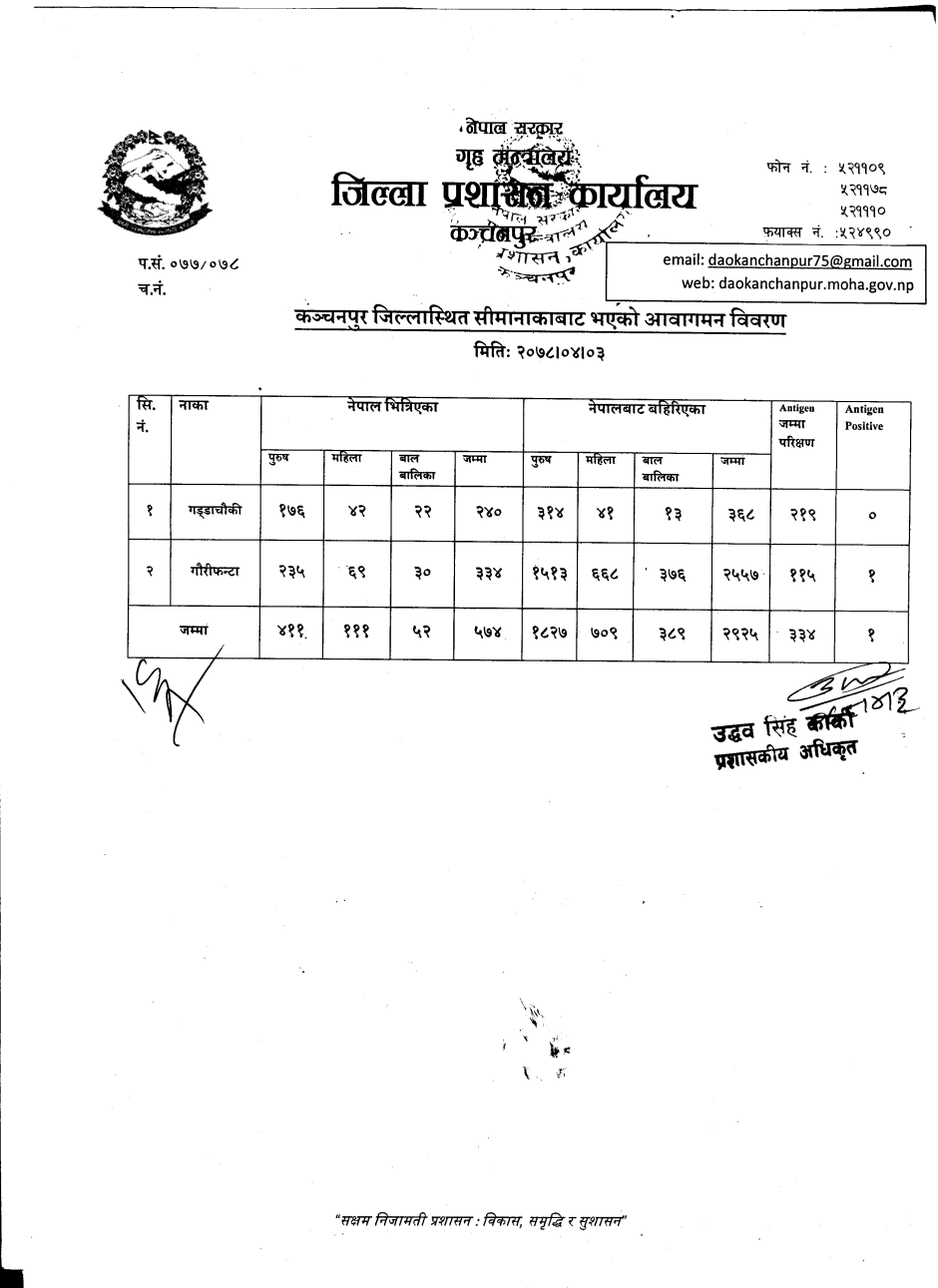 मिति २०७८।०४।०३ गते सीमानाकाबाट भएको आवागमन विवरण