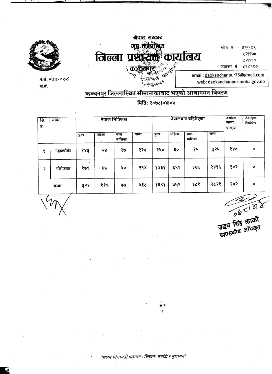 मिति २०७८।०४।०४ गते सीमानाकाबाट भएको आवागमन विवरण
