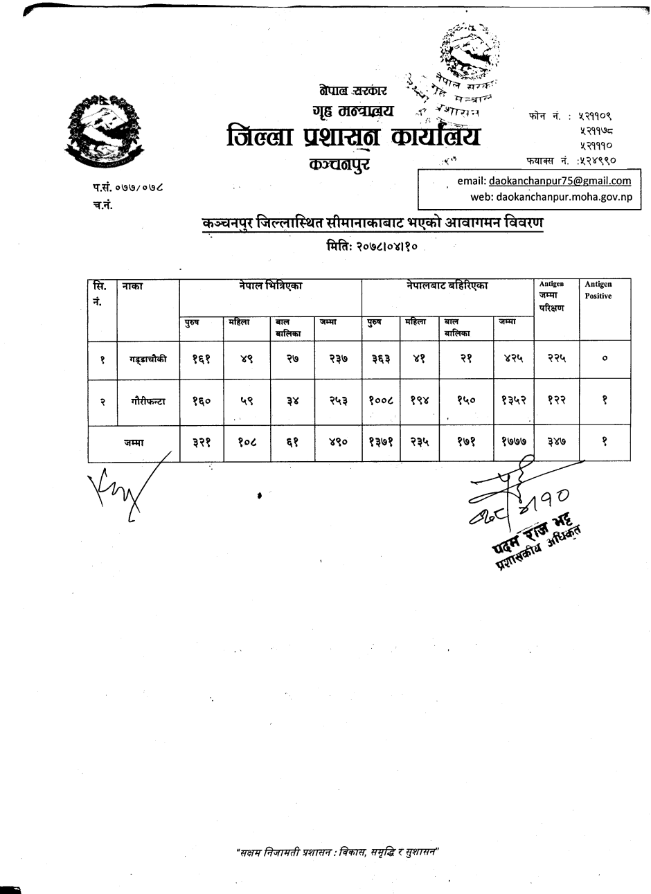 मिति २०७८।०४।१० गते सीमानाकाबाट भएको आवागमन विवरण