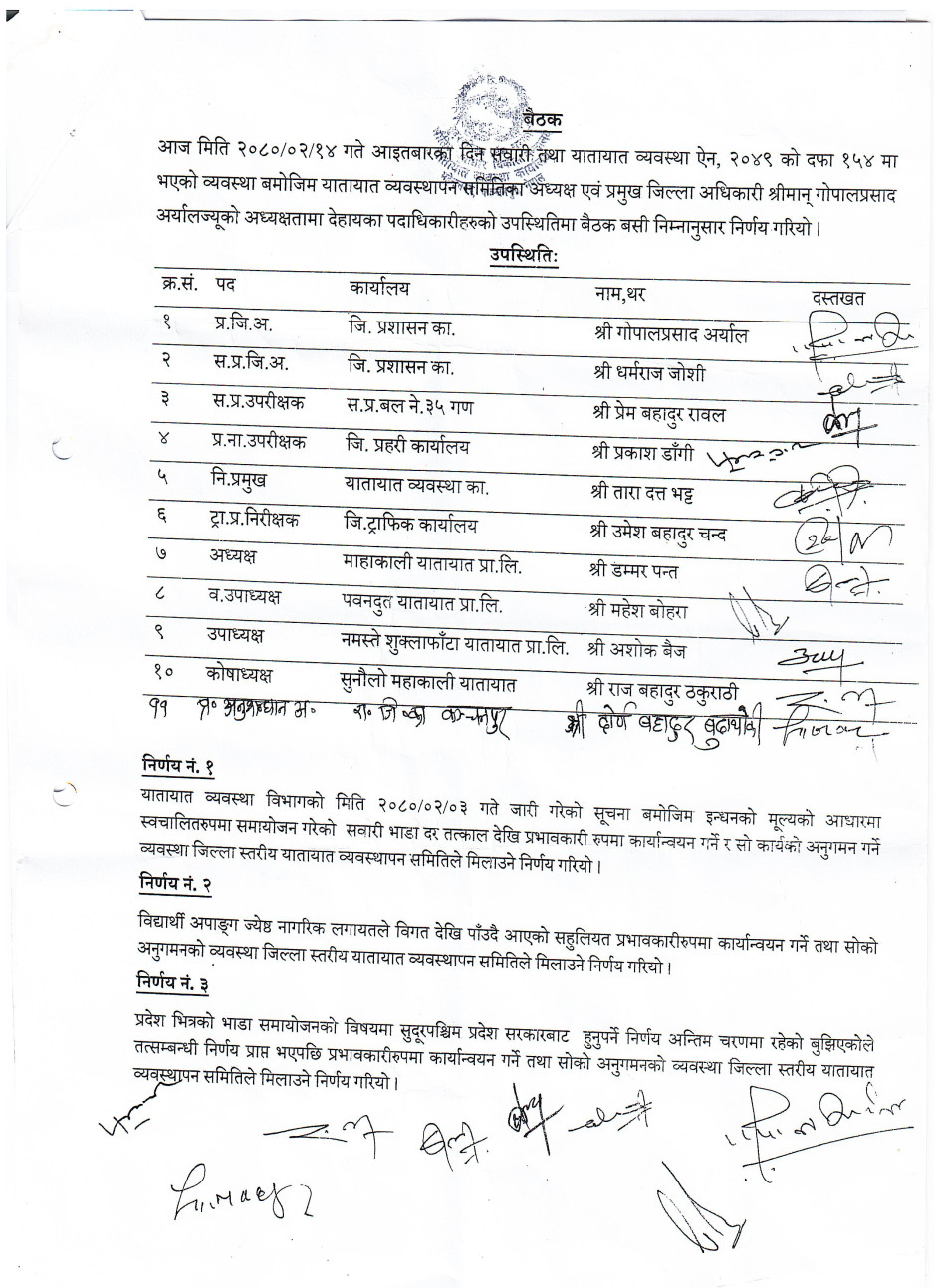 मिति २०८२।०२।०७ गते बसेको यातायात व्यवस्थापन समितिको बैठकको निर्णयहरु