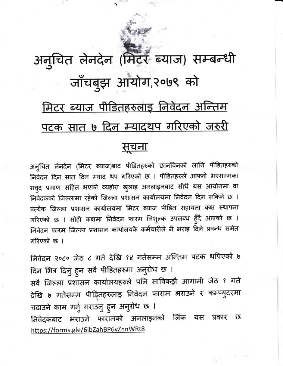 मिटर ब्याज पीडितहरुलाइ निवेदन दिन ७ दिन म्याद थप गरिएको जरुरी सूचना