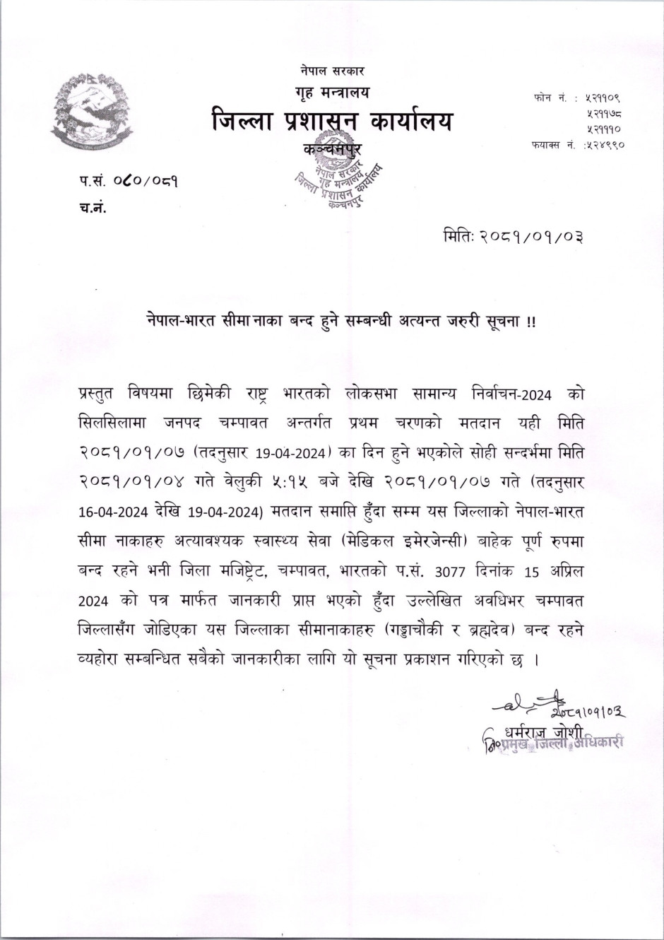 नेपाल-भारत सीमा नाका बन्द हुने सम्बन्धी अत्यन्त जरुरी सूचना