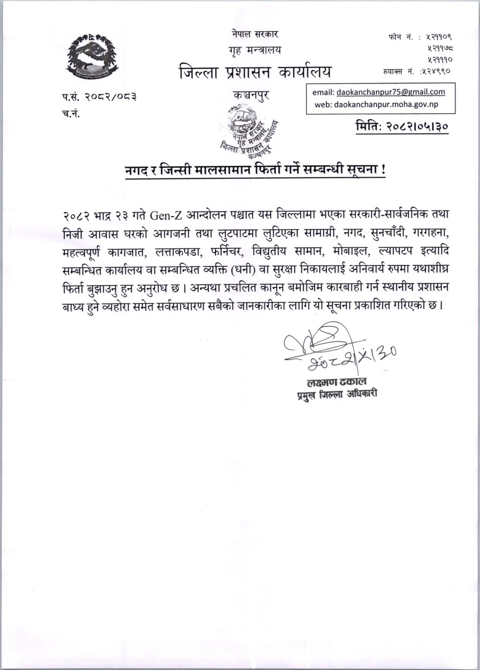 नगद र जिन्सी मालसामान फिर्ता गर्ने सम्बन्धी सूचना !